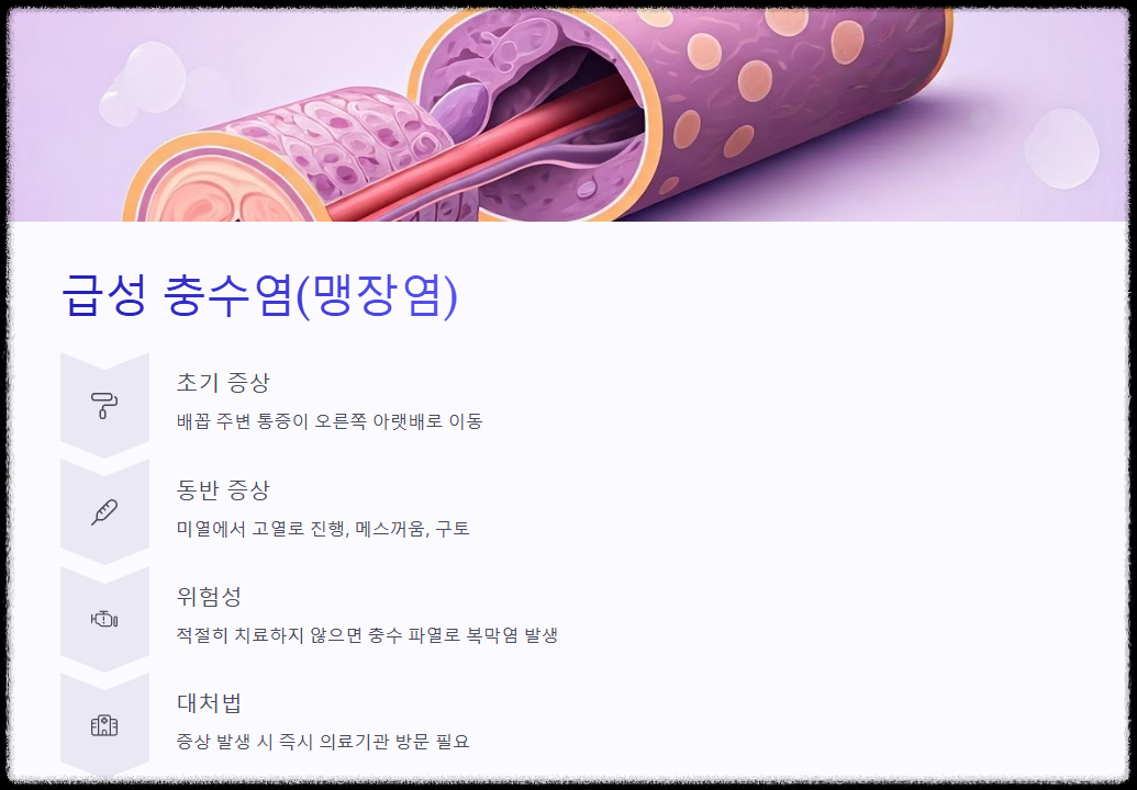 가장 흔히 알려진 오른쪽 아랫배 통증의 원인은 바로 급성 충수염입니다. 처음에는 배꼽 주변에서 시작된 통증이 점차 오른쪽 아랫배로 이동하며 심해지는 특징이 있습니다. 다음과 같은 증상이 동반될 수 있습니다: