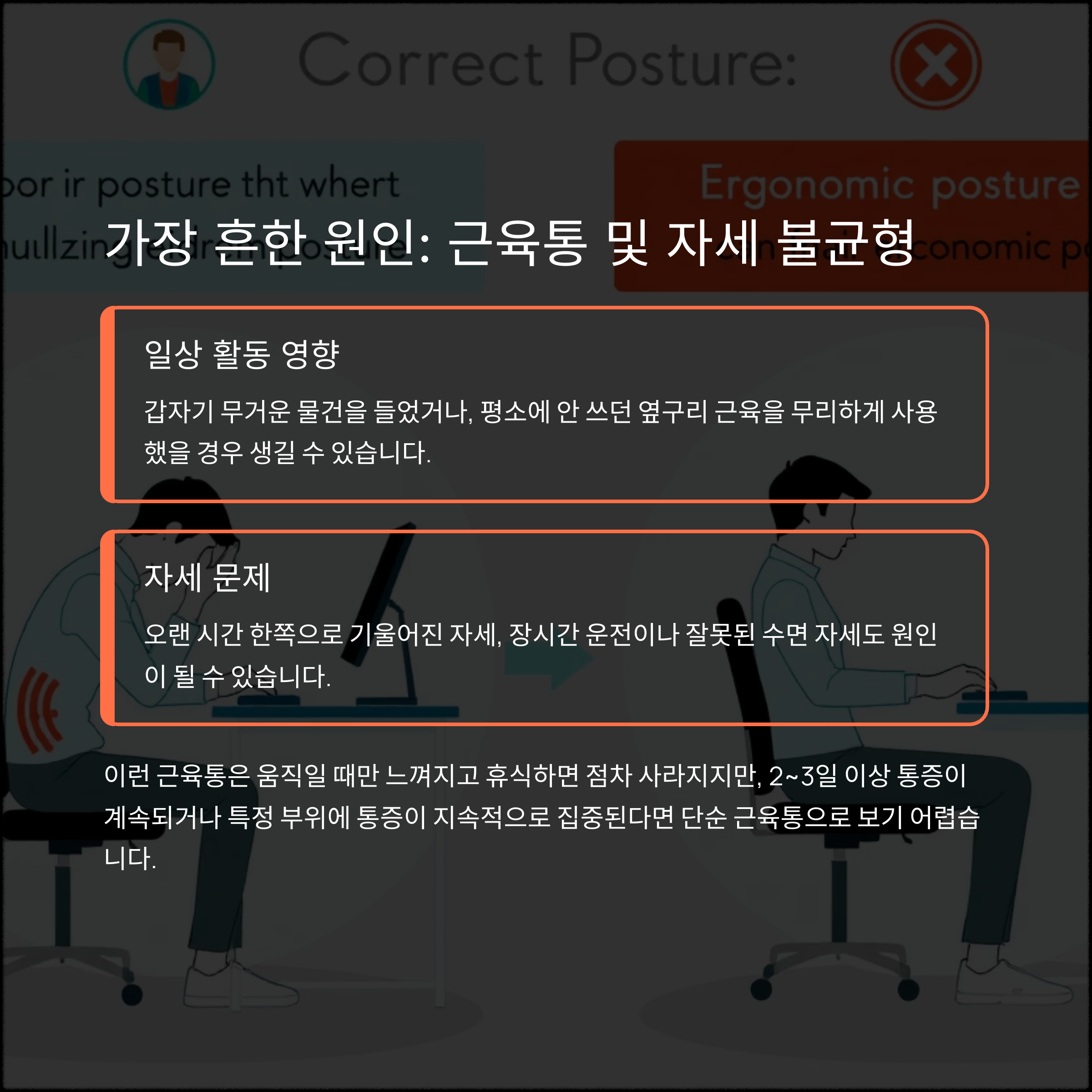 오른쪽 옆구리 통증 중 가장 흔한 원인은 근육통입니다. 갑자기 무거운 물건을 들었거나, 평소에 안 쓰던 옆구리 근육을 무리하게 사용했을 경우 생길 수 있습니다. 또한 오랜 시간 한쪽으로 기울어진 자세, 장시간 운전이나 잘못된 수면 자세 역시 원인이 될 수 있습니다.