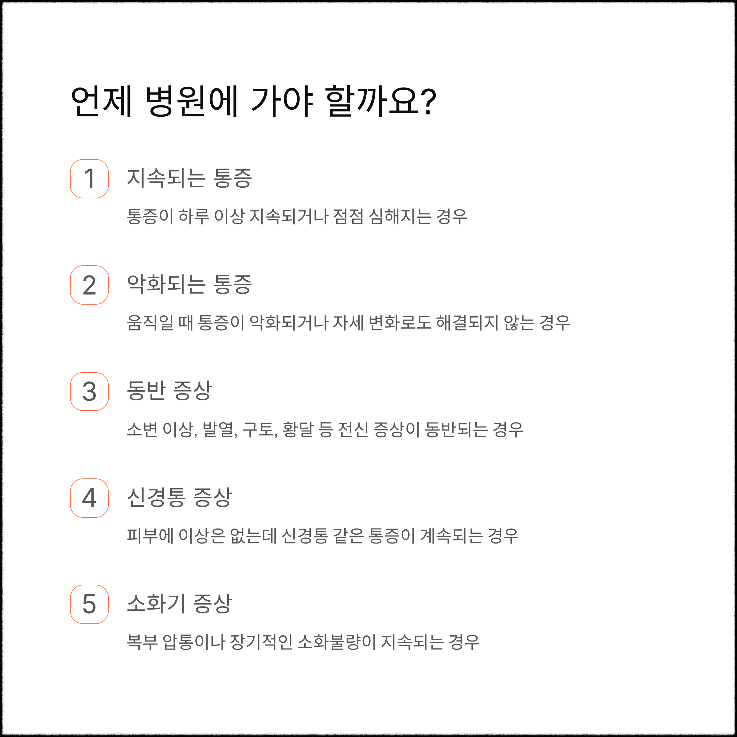 - 움직일 때 통증이 악화되거나 자세 변화로도 해결되지 않는 경우