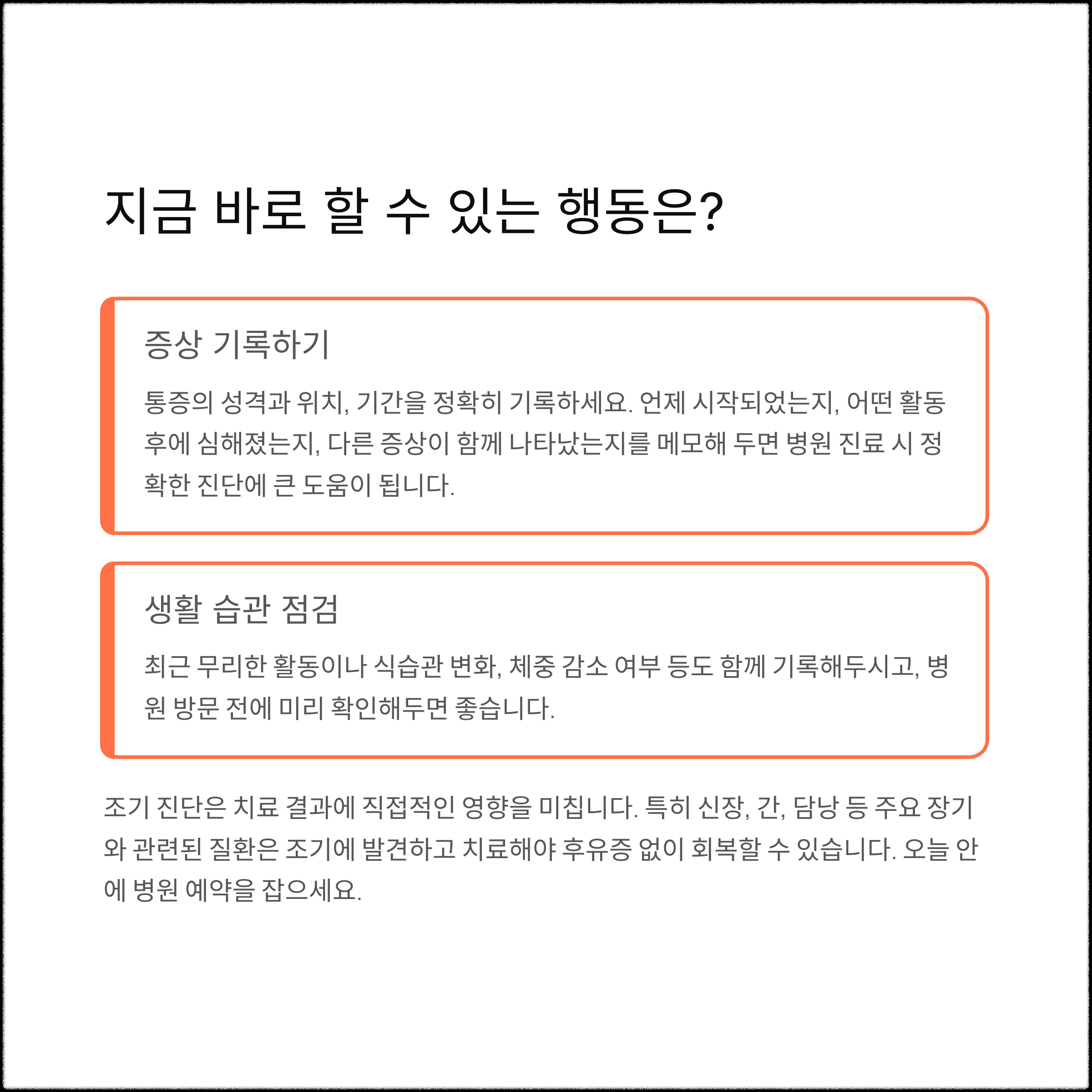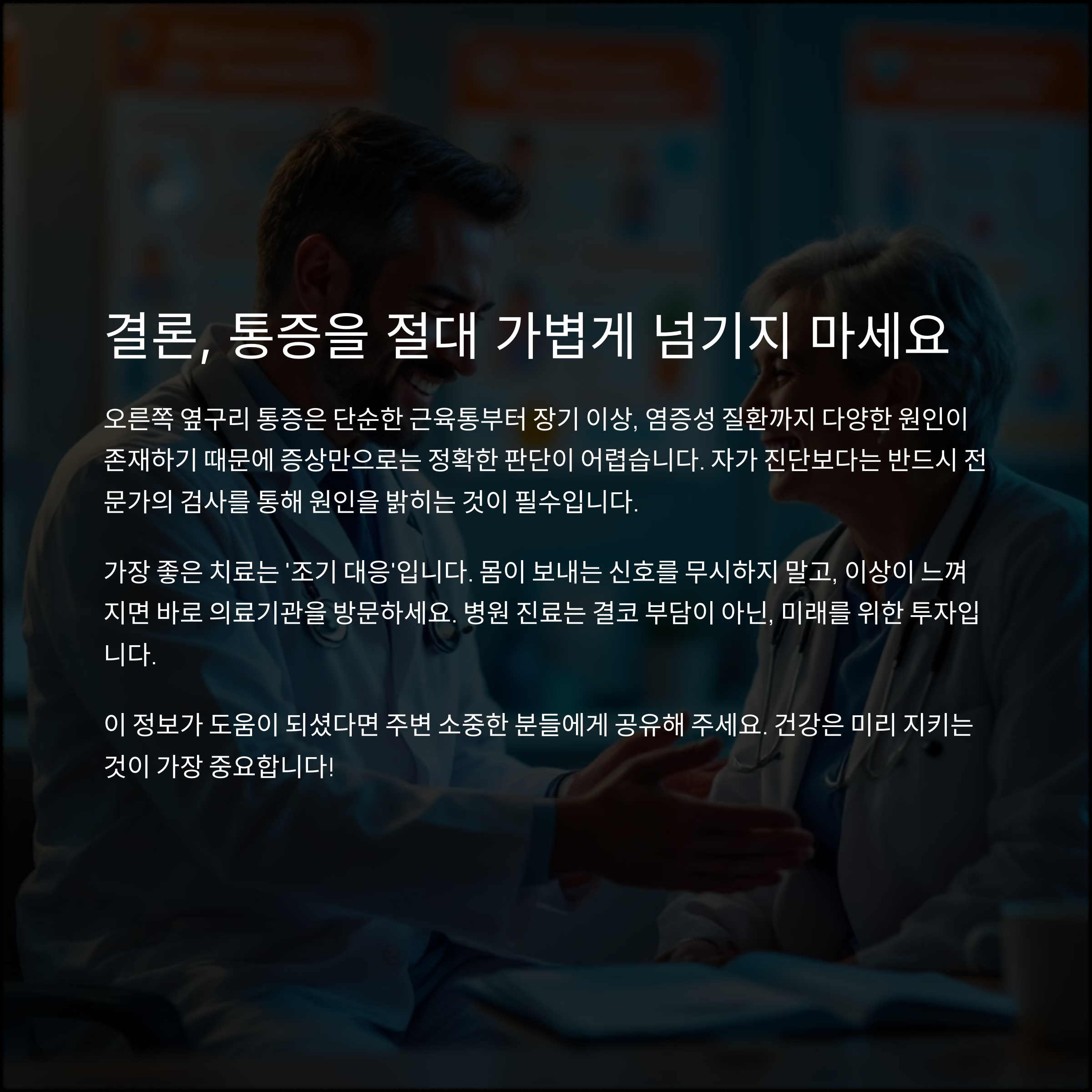 조기 진단은 치료 결과에 직접적인 영향을 미칩니다. 특히 신장, 간, 담낭 등 주요 장기와 관련된 질환은 조기에 발견하고 치료해야 후유증 없이 회복할 수 있습니다. 오른쪽 옆구리 통증이 계속된다면, 오늘 안에 병원 예약을 잡으세요. 통증은 신체의 경고 신호입니다.