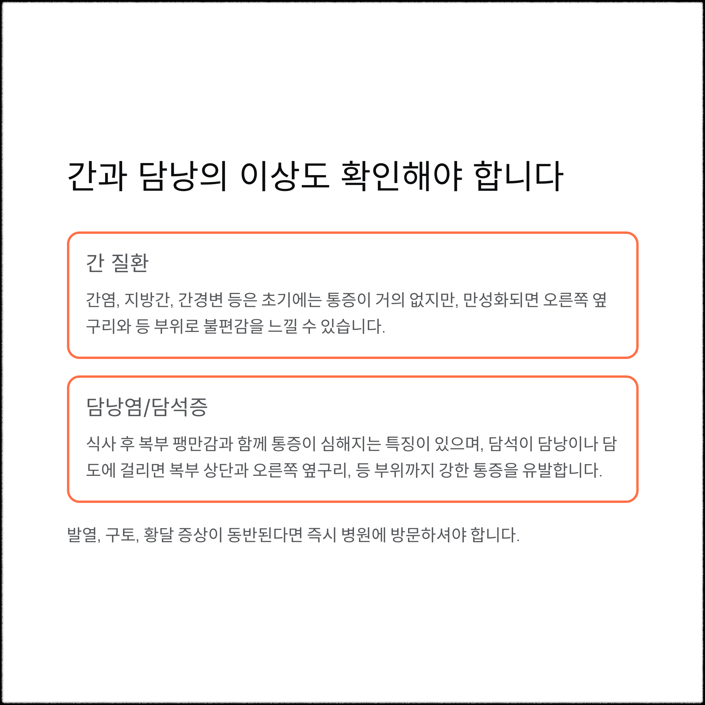 단순히 옆구리 근육을 무리해서 생긴 통증일 수도 있지만, 그 통증이 찌르는 듯하거나 지속적이고 복부까지 퍼진다면 내과적 질환 가능성을 반드시 고려해야 합니다.