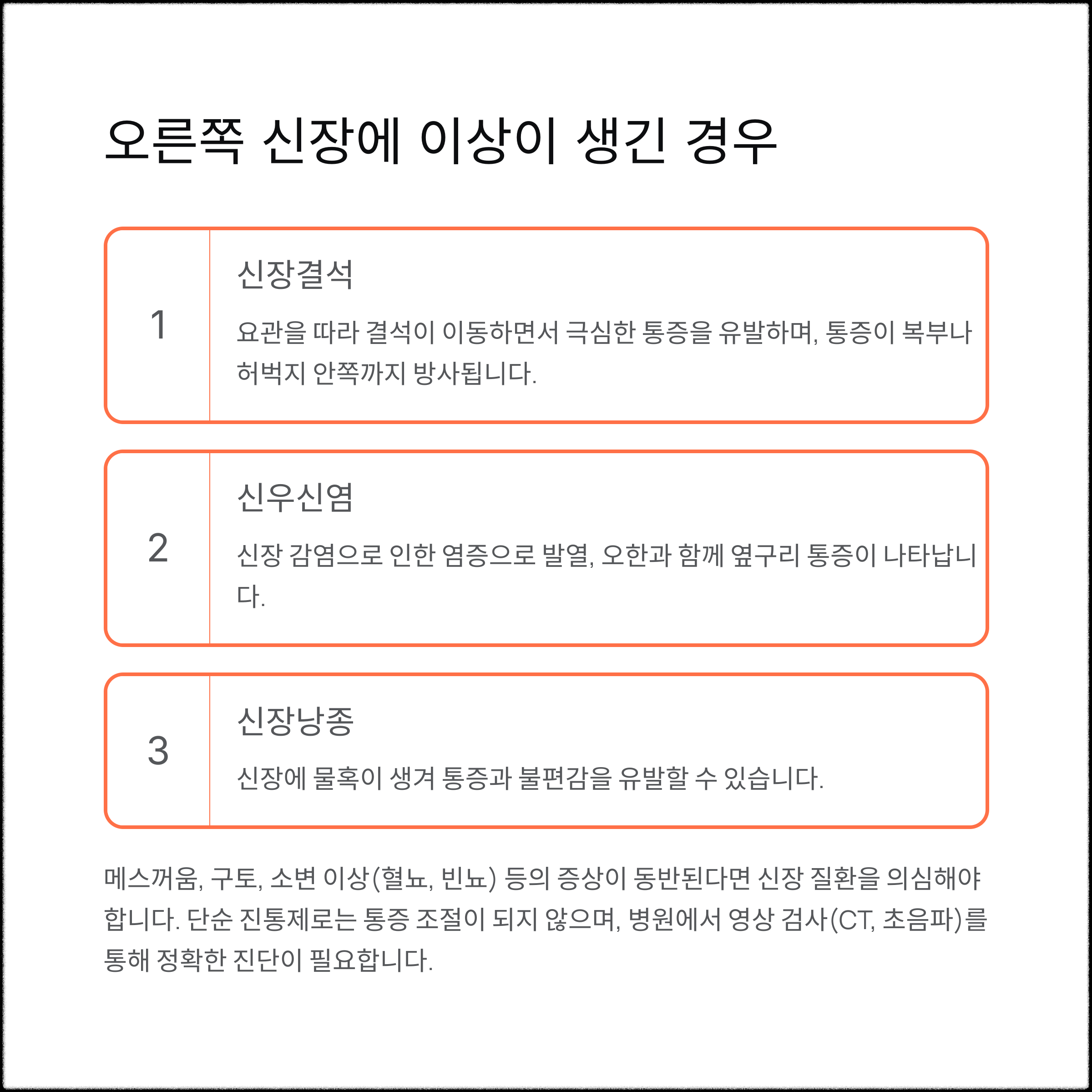 오른쪽 옆구리 안쪽에 위치한 신장에 문제가 생기면 둔통 또는 요통처럼 느껴지는 통증이 발생할 수 있습니다. 대표적인 질환으로는 신장결석, 신우신염, 신장낭종 등이 있습니다.