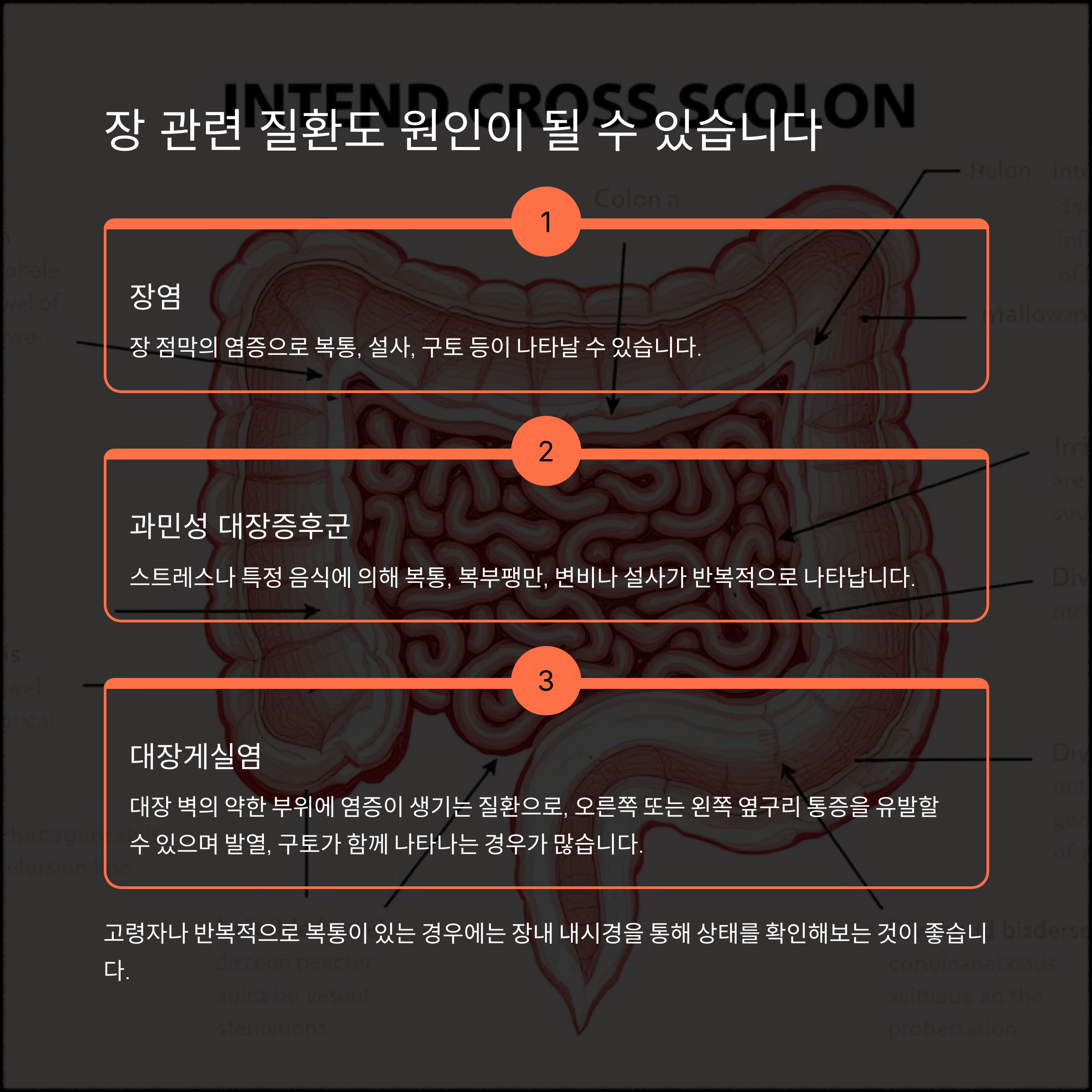 장염, 과민성 대장증후군, 대장게실염 등도 오른쪽 옆구리 통증의 원인이 될 수 있습니다. 장 질환의 경우 복통과 함께 설사, 복부팽만, 변비 등의 증상이 동반되는 경우가 많습니다.
