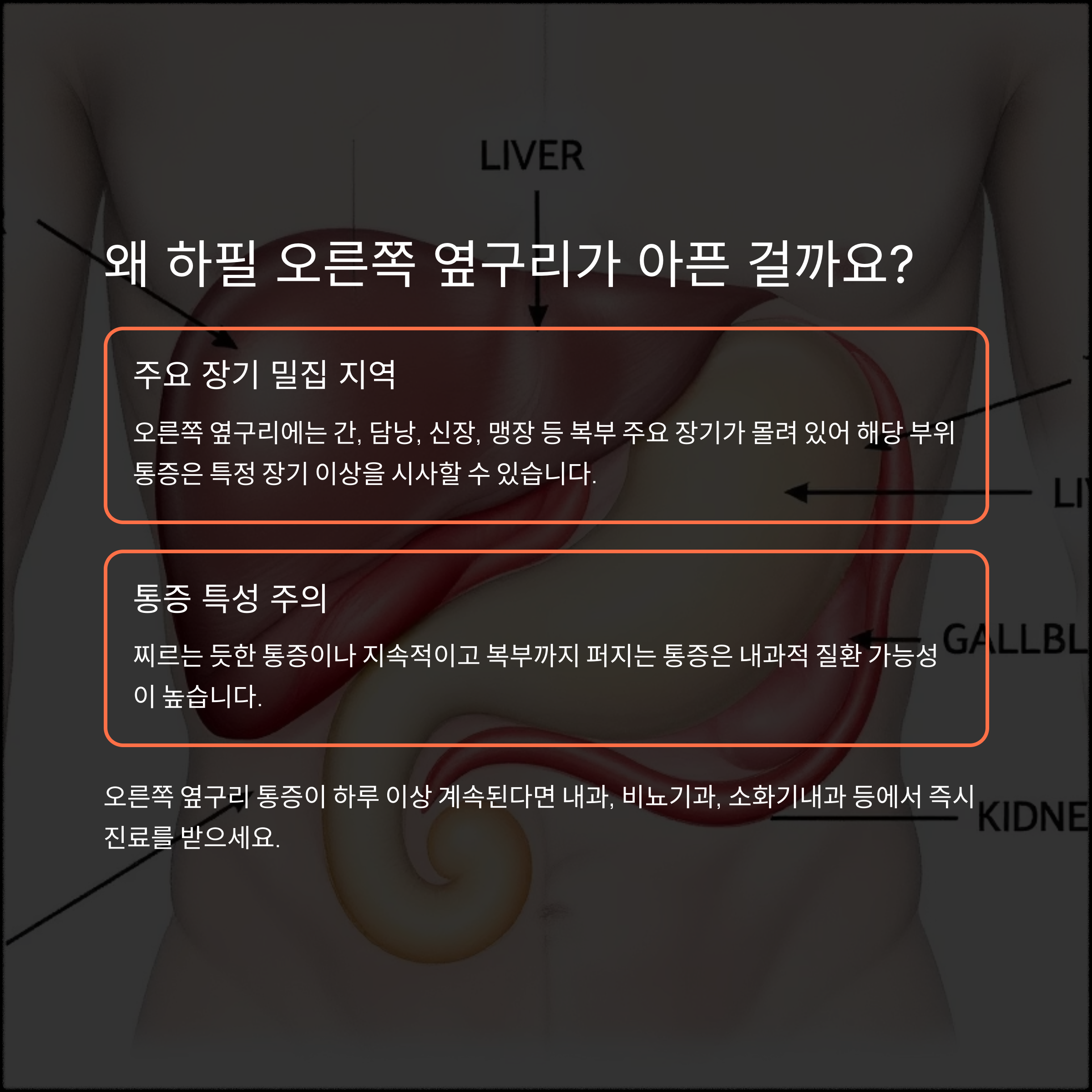 사람의 몸은 부위별로 통증 원인이 다르게 나타납니다. 특히 오른쪽 옆구리에는 간, 담낭, 신장, 맹장 등 복부 주요 장기가 몰려 있어, 해당 부위의 통증은 특정 장기의 이상을 시사할 수 있습니다.