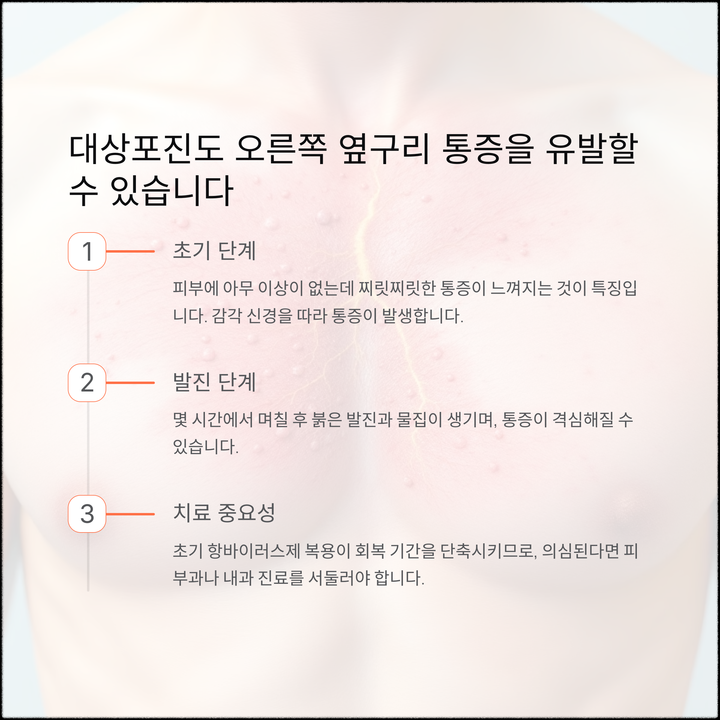 오른쪽 옆구리 통증으로 시작해 몇 시간에서 며칠 후 붉은 발진과 물집이 생기며, 통증이 격심해질 수 있습니다. 이 경우 초기 항바이러스제 복용이 회복 기간을 단축시키므로, 의심된다면 피부과나 내과 진료를 서둘러야 합니다.