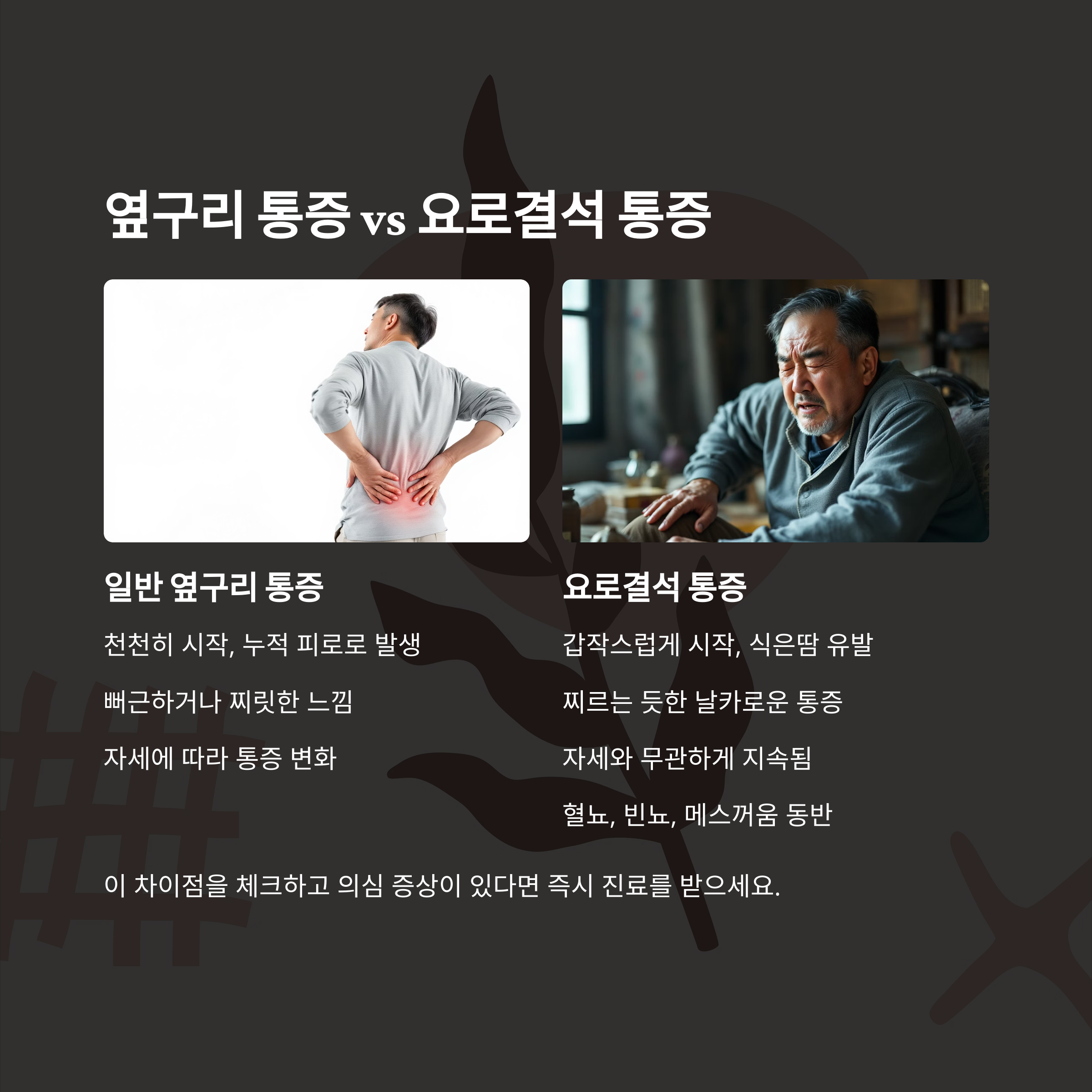 옆구리 통증은 요로결석 외에도 허리디스크, 근육통, 신우신염, 대상포진 등 여러 질환에서 발생할 수 있습니다. 그런데 요로결석과의 차이는 바로 "통증의 양상과 지속 시간"입니다. 일반적인 근육통은 움직일 때 아프고 일정한 패턴을 따릅니다. 반면 요로결석은 갑자기 시작되어 멈췄다 반복되는 경향이 있으며, 움직이거나 자세를 바꿔도 통증이 가시지 않습니다.