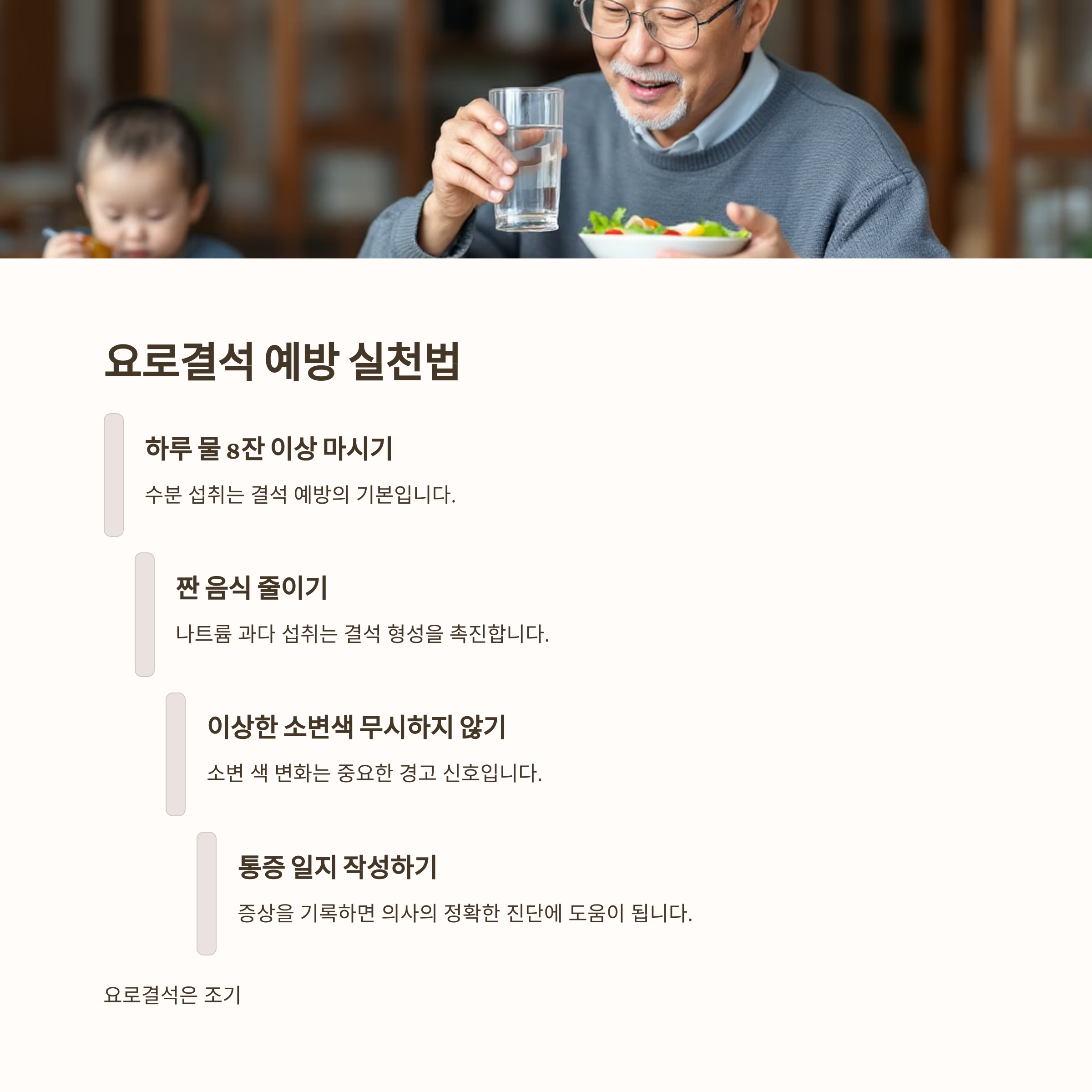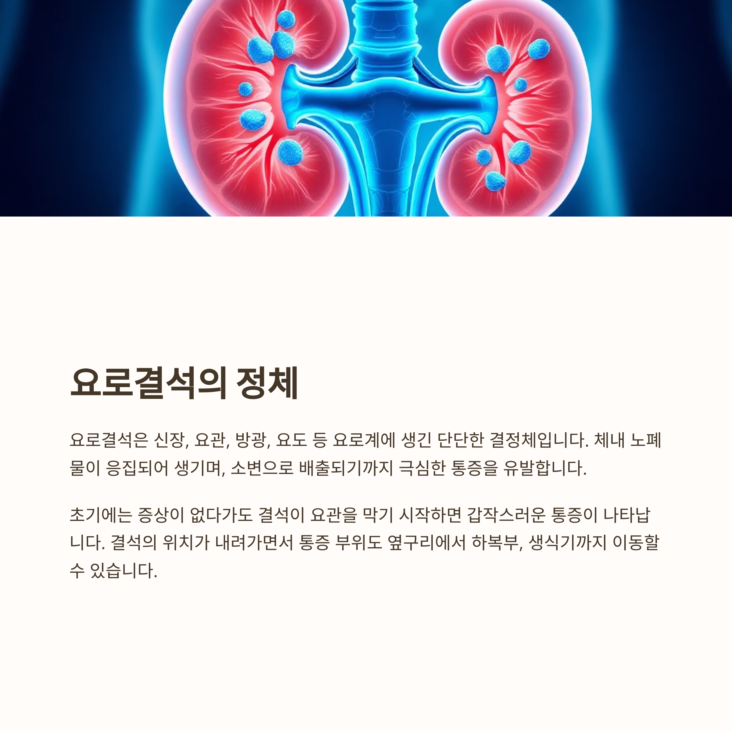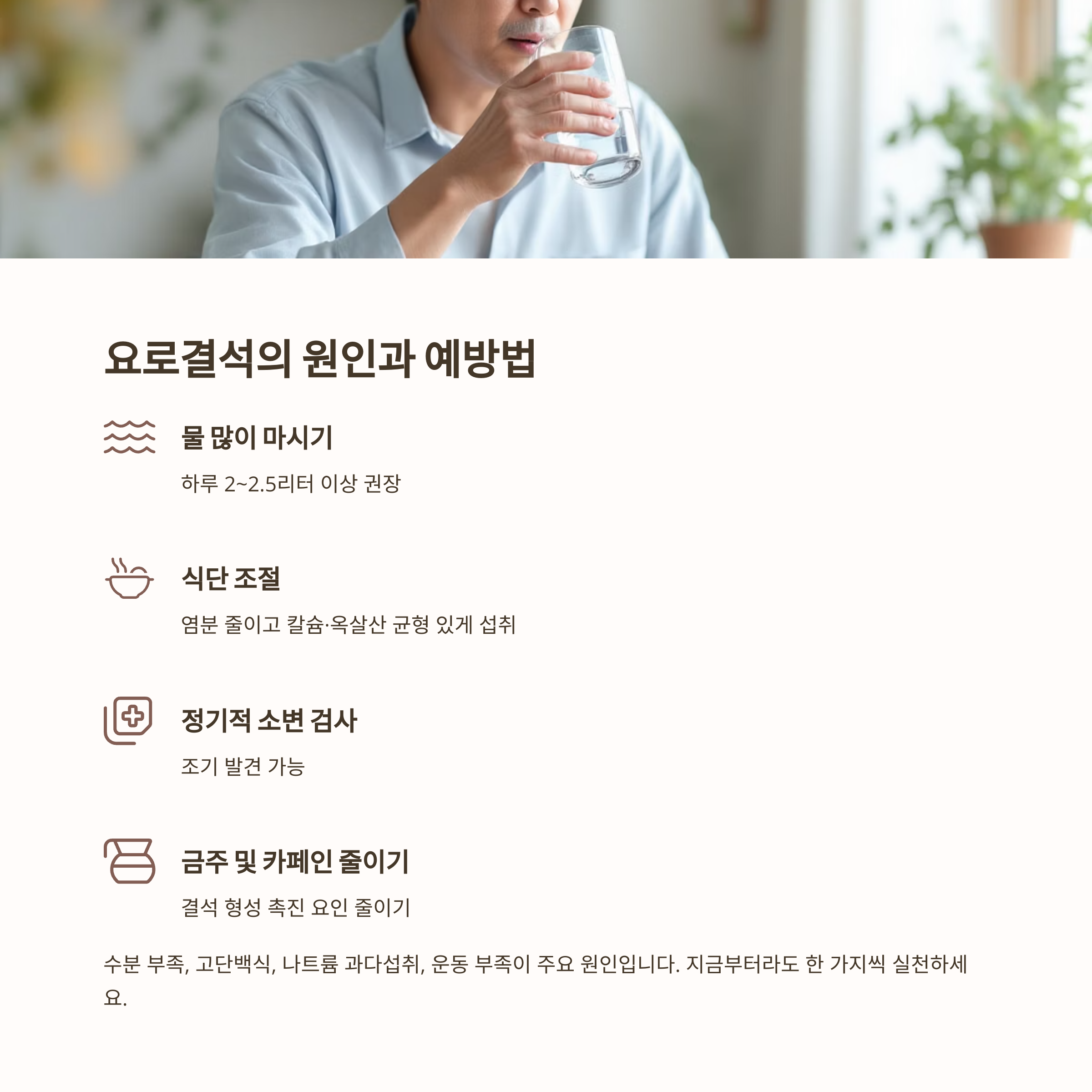 요로결석은 조기 발견과 예방법만 잘 지켜도 충분히 피할 수 있는 질환입니다. 지금 당장 할 수 있는 행동부터 시작하세요.