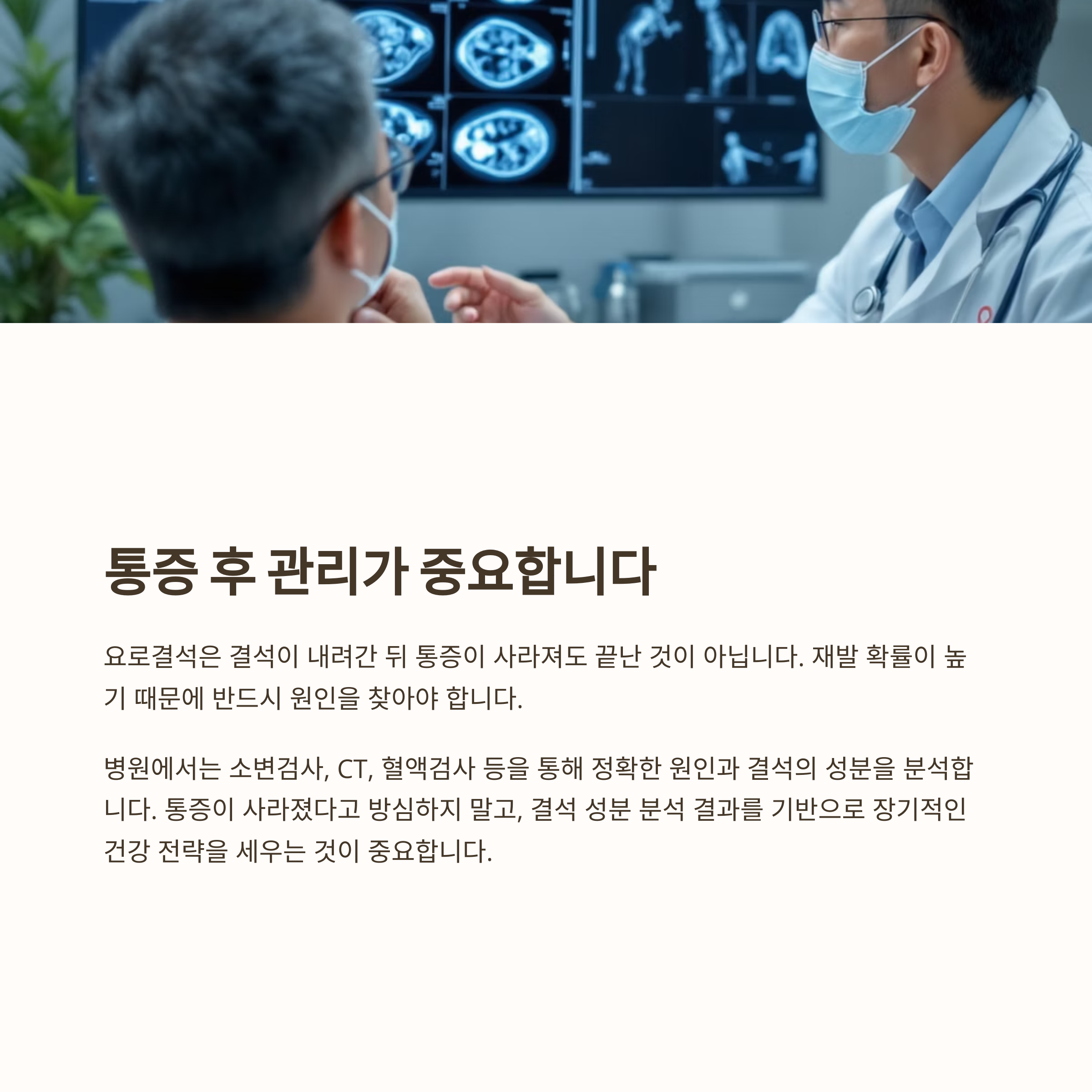 그에 따라 식단, 수분 섭취, 운동 등의 맞춤형 생활 개선이 필요합니다. 통증이 사라졌다고 방심하지 말고, 결석 성분 분석 결과를 기반으로 장기적인 건강 전략을 세우는 것이 중요합니다.
