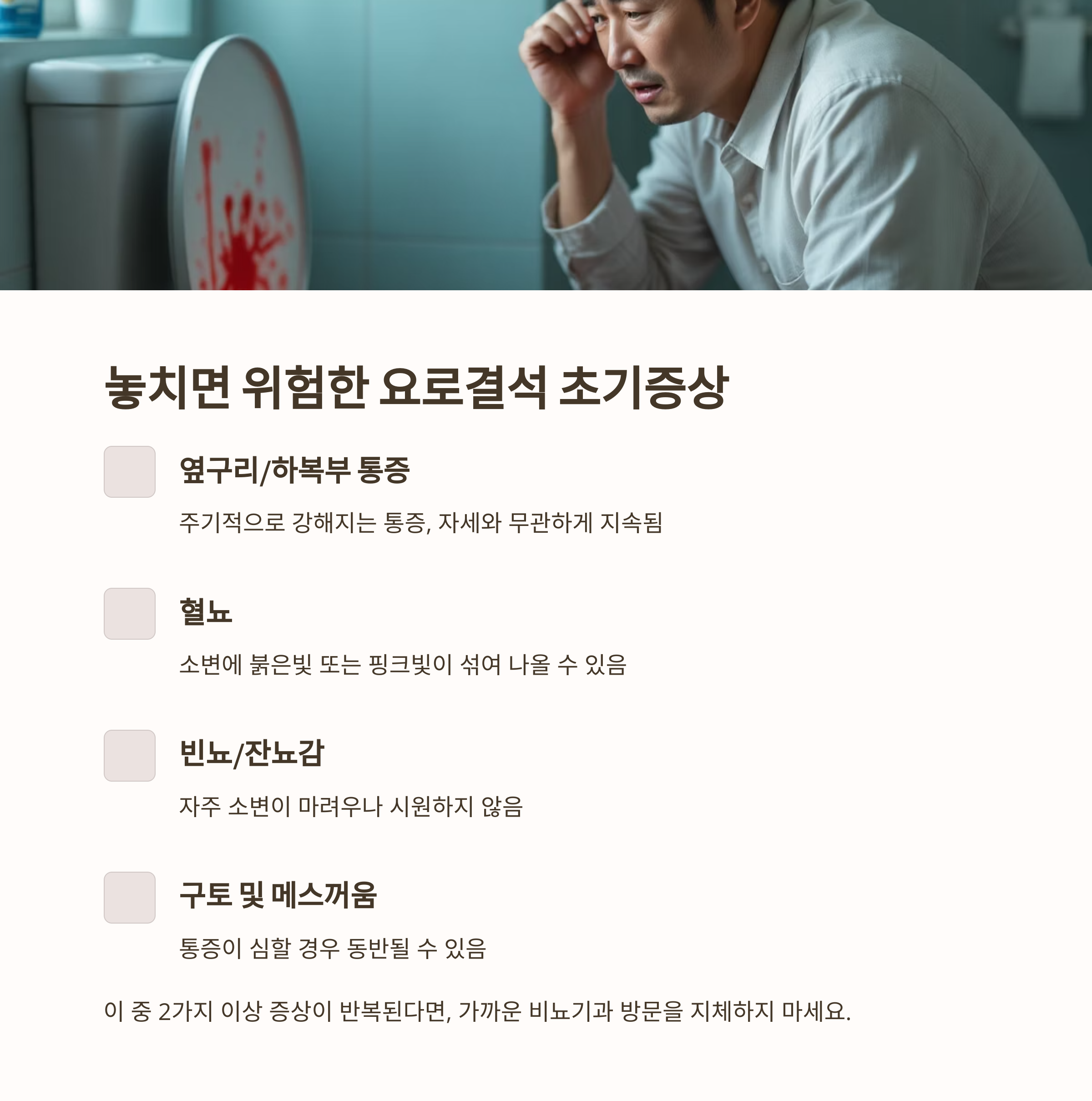 요로결석은 무증상으로 시작하는 경우가 많지만, 아래와 같은 초기 징후가 있다면 절대 무시해서는 안 됩니다.