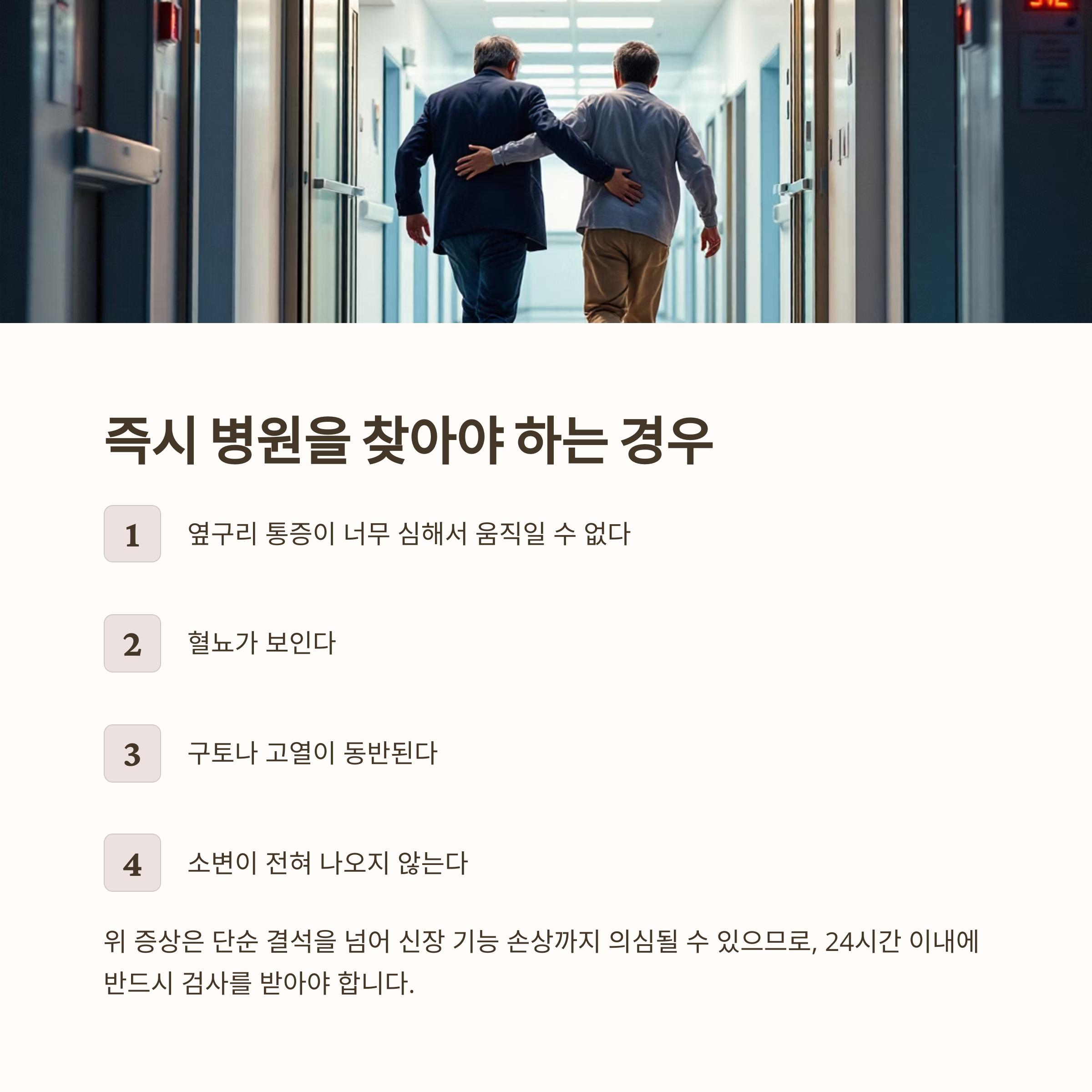 위와 같은 증상은 단순 결석을 넘어서 ‘신장 기능 손상’까지 의심될 수 있는 상황이므로, 24시간 이내에 반드시 검사를 받아야 합니다.