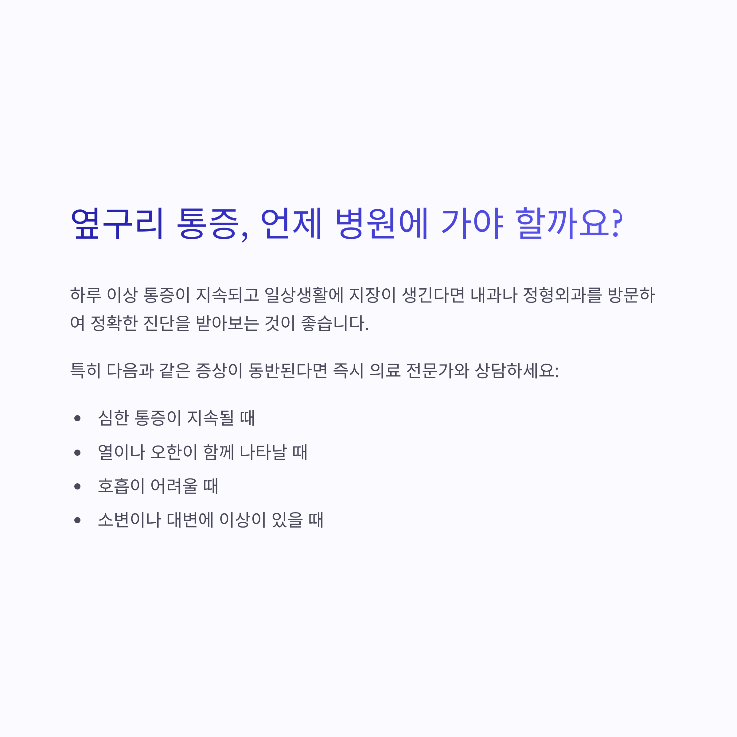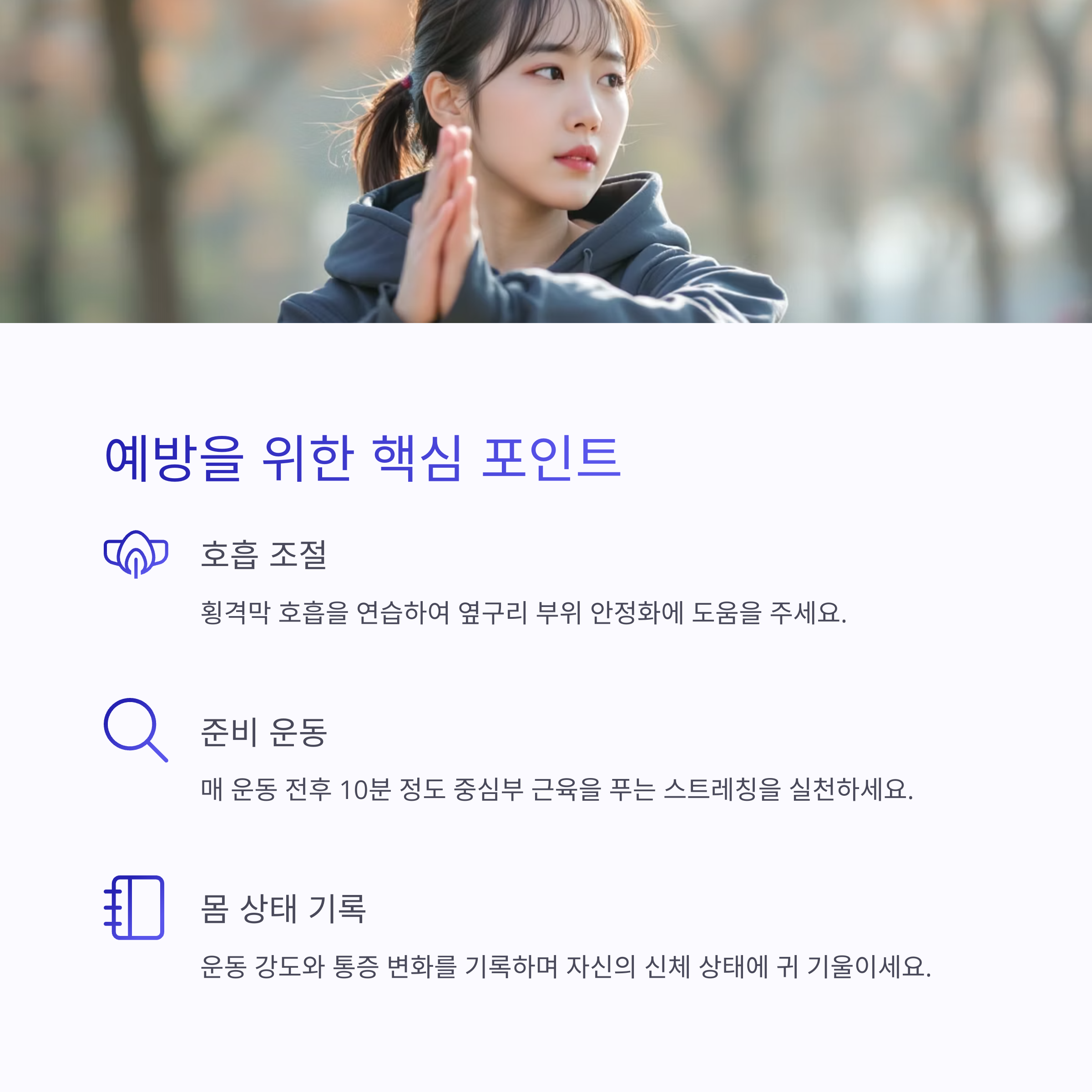 | 외복사근과 복횡근 등 코어 근육이 주 원인일 수 있습니다. | 하루 3회, 10분씩 꾸준히 반복하는 것이 좋습니다. | 하루 한 번 실천해도 통증 예방 효과가 큽니다. |