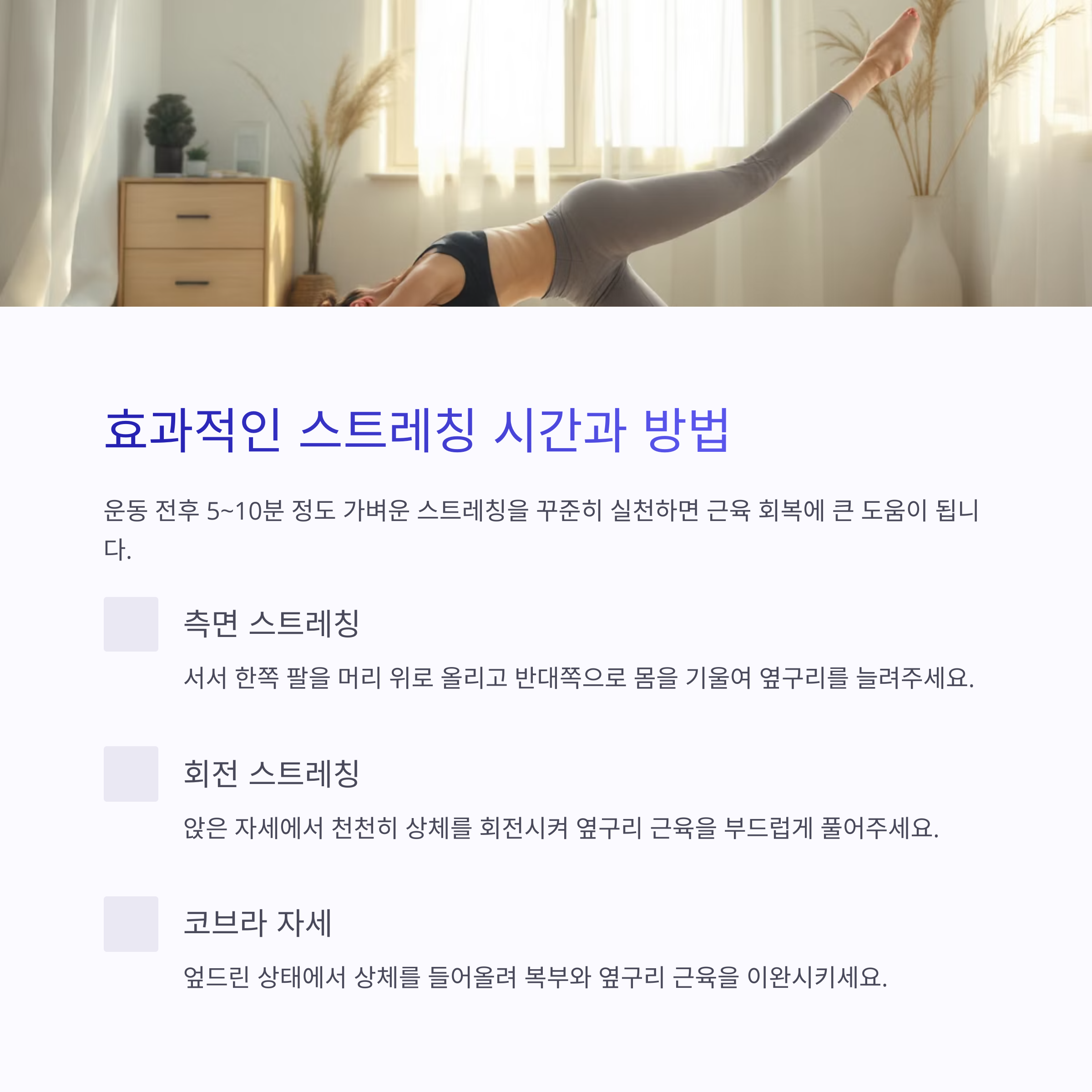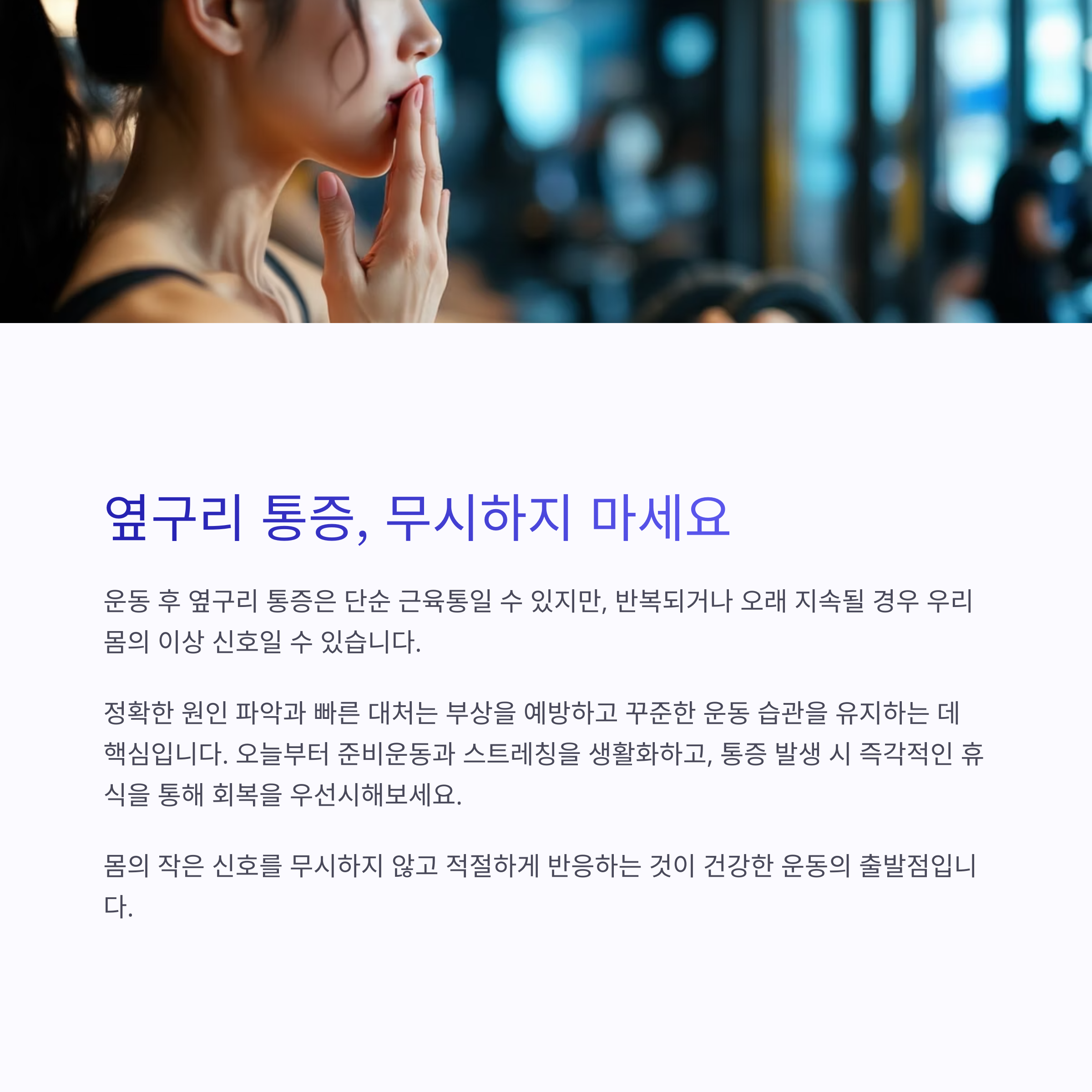 | 운동 후 옆구리 통증을 유발하는 대표적인 근육 문제입니다. | 염증 완화와 빠른 통증 회복에 효과적인 즉시 대처법입니다. | 유연성과 회복력을 높이는 핵심 운동 루틴입니다. |