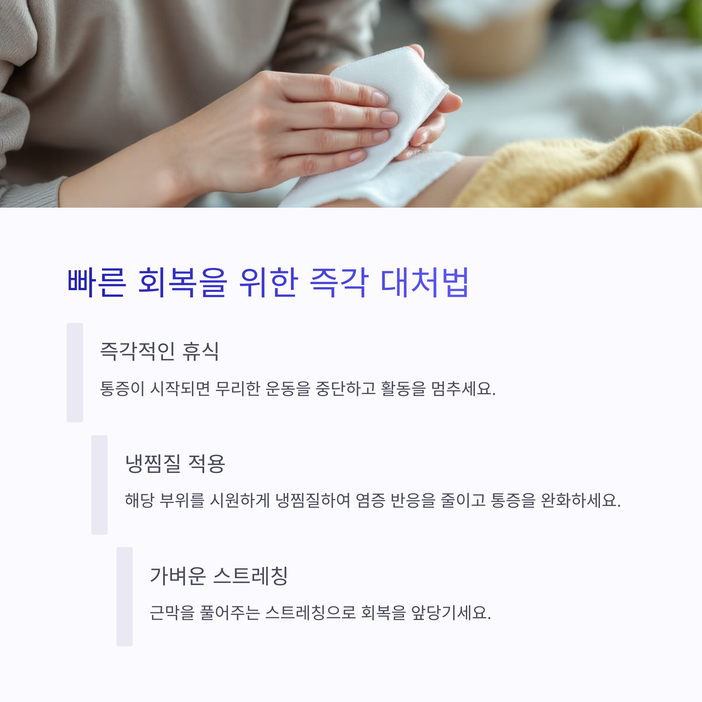 | 빠르게 회복하는 방법 | 휴식, 냉찜질, 스트레칭, 운동 강도 조절 |