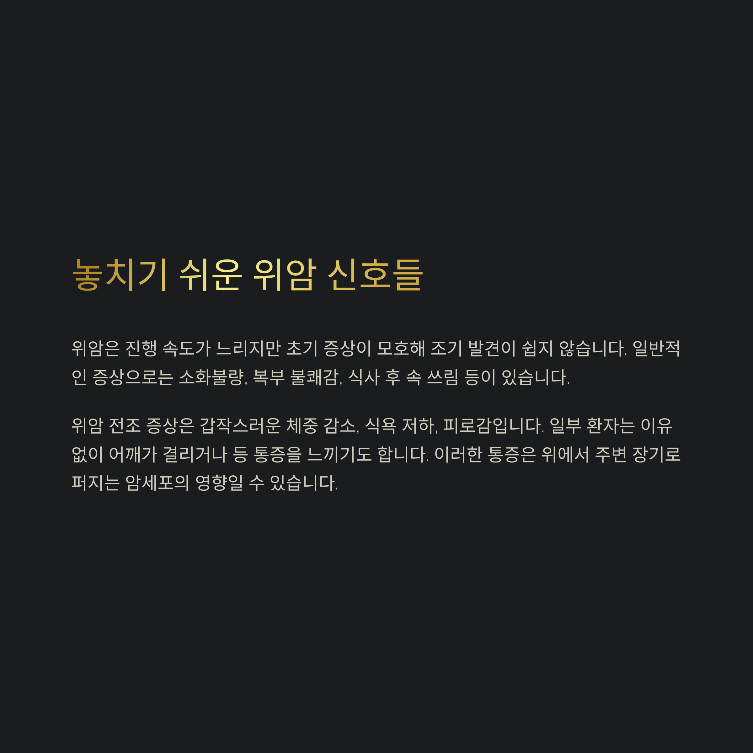 | 위 내 불편감, 더부룩함, 식욕 감퇴 등이 특징입니다. | 이유 없는 체중 감소와 전신 피로감은 주의 신호입니다. | 위내시경과 조직검사로 조기에 발견할 수 있습니다. |