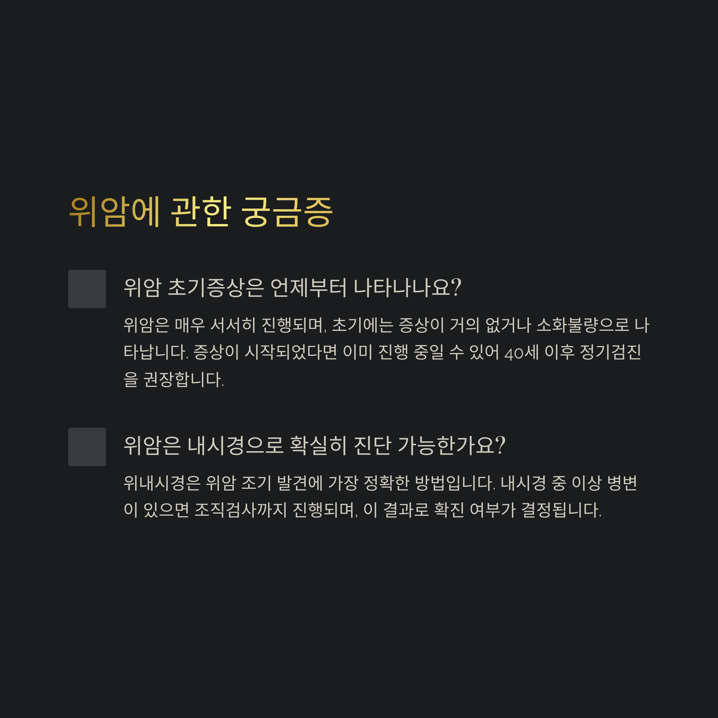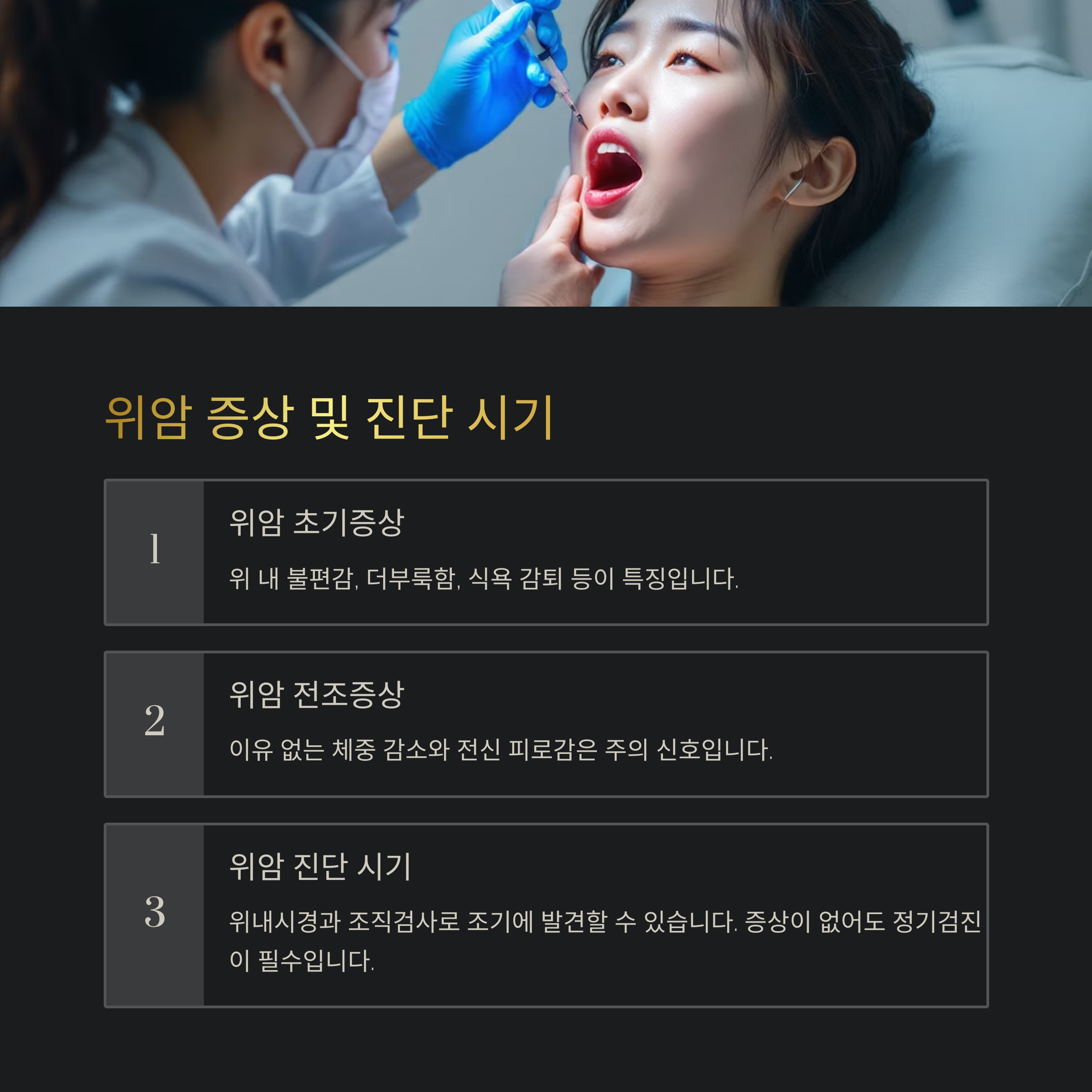위 내 불편감, 더부룩함, 식욕 감퇴 등이 특징입니다. | 이유 없는 체중 감소와 전신 피로감은 주의 신호입니다. | 위내시경과 조직검사로 조기에 발견할 수 있습니다. |