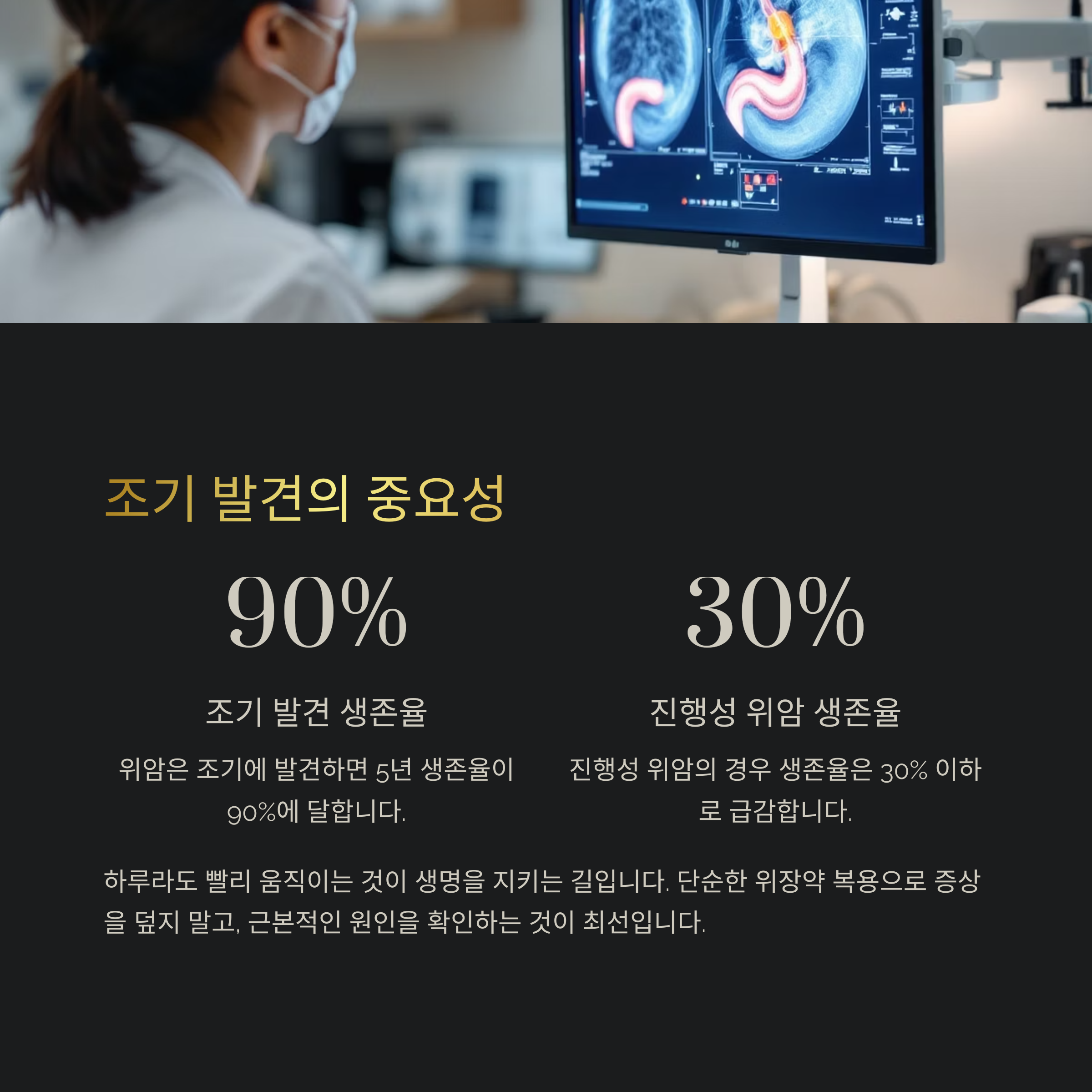 위암은 조기에 발견하면 5년 생존율이 90%에 달합니다. 반면 진행성 위암의 경우 생존율은 30% 이하로 급감합니다. 하루라도 빨리 움직이는 것이 생명을 지키는 길입니다. 증상이 가볍다고 방심하지 말고, 지금 이 글을 닫은 후 바로 건강검진 예약을 진행하세요. 단순한 위장약 복용으로 증상을 덮지 말고, 근본적인 원인을 확인하는 것이 최선입니다. 현재도 건강검진 지원사업이 있는 지역이 많으니 보건소나 주민센터를 통해 확인하고 적극적으로 활용하길 추천드립니다.