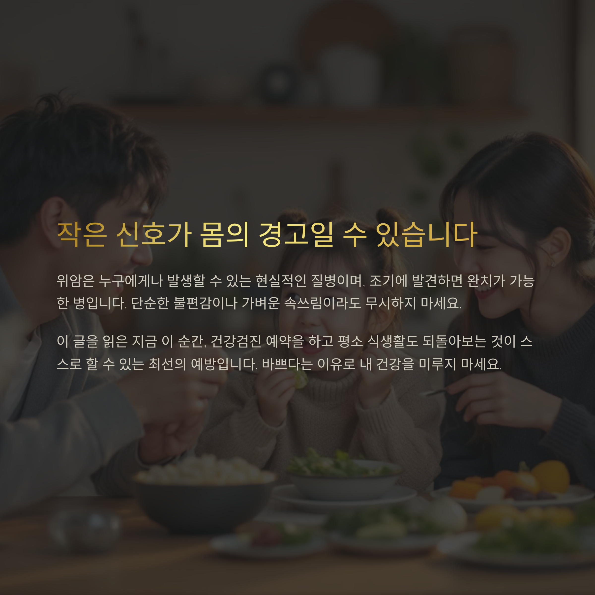 위암은 누구에게나 발생할 수 있는 현실적인 질병이며, 조기에 발견하면 완치가 가능한 병입니다. 단순한 불편감이나 가벼운 속쓰림이라도 무시하지 마세요. 작은 신호가 몸의 경고일 수 있습니다. 이 글을 읽은 지금 이 순간, 건강검진 예약을 하고 평소 식생활도 되돌아보는 것이 스스로 할 수 있는 최선의 예방입니다. 바쁘다는 이유로 내 건강을 미루지 마세요. 당신이 오늘 한 행동이 10년 후의 삶을 바꿀 수 있습니다.