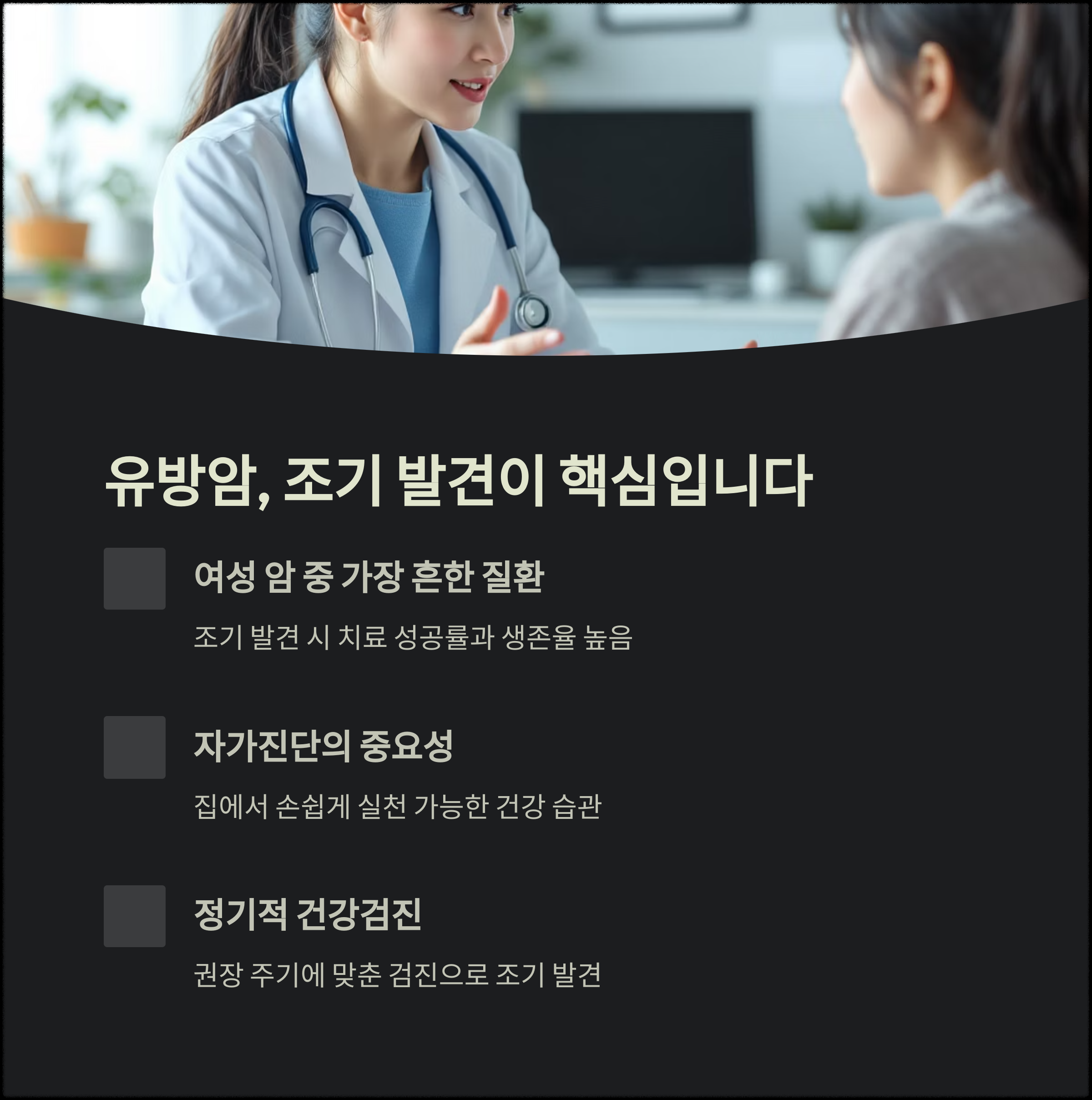 유방암 자가진단과 정기적인 건강검진은 여성 건강 관리에서 매우 중요한 부분입니다. 스스로 몸의 변화를 민감하게 관찰하고, 의료진과의 협력을 통해 정기 검진을 꾸준히 받으면 유방암 조기 발견과 치료에 큰 도움이 됩니다. 오늘 안내해드린 내용을 참고하여 평소 건강 습관으로 실천해보세요. 나와 가족의 건강을 지키는 작은 실천이 큰 차이를 만듭니다.