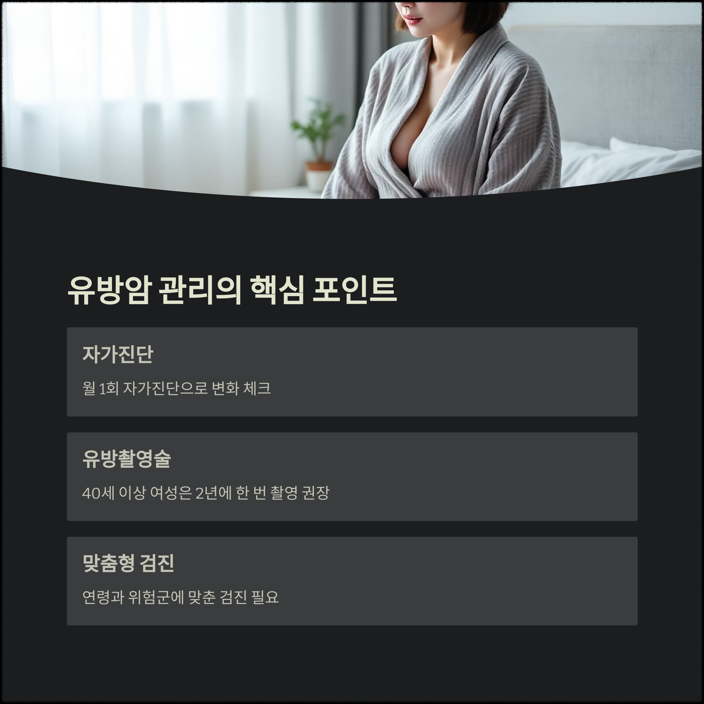 | 월 1회 자가진단으로 변화 체크 | 40세 이상 여성은 2년에 한 번 촬영 권장 | 연령과 위험군에 맞춘 맞춤형 검진 필요 |