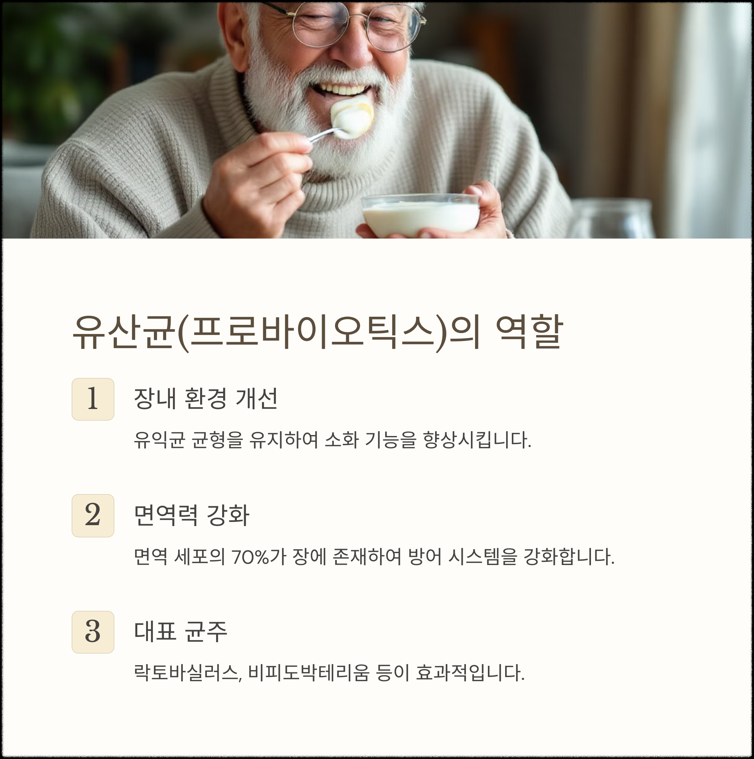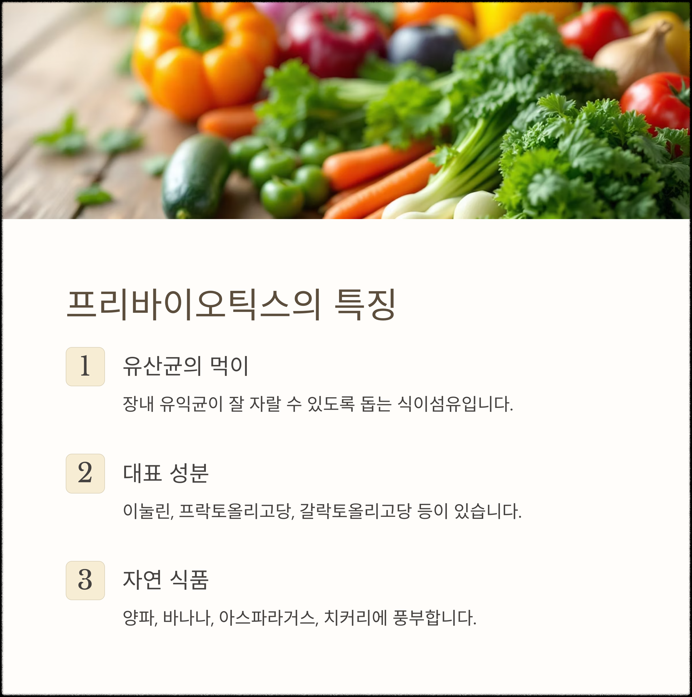 락토바실러스, 비피도박테리움 등이 대표적입니다. | 이눌린, 프락토올리고당 등 식이섬유 성분입니다. | 균형 잡힌 미생물 환경 유지가 중요합니다. |