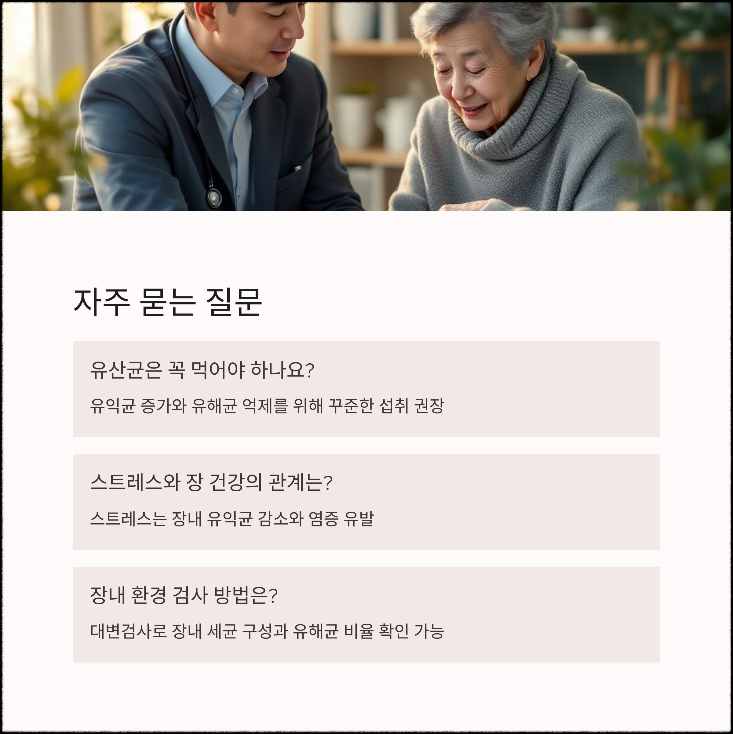 스트레스도 장내 환경 악화의 중요한 요인 중 하나입니다. | 요구르트, 김치, 된장 등 발효식품도 훌륭한 유산균 공급원입니다. | 장 건강은 면역력과 피부, 정신 건강에도 영향을 줍니다. |
