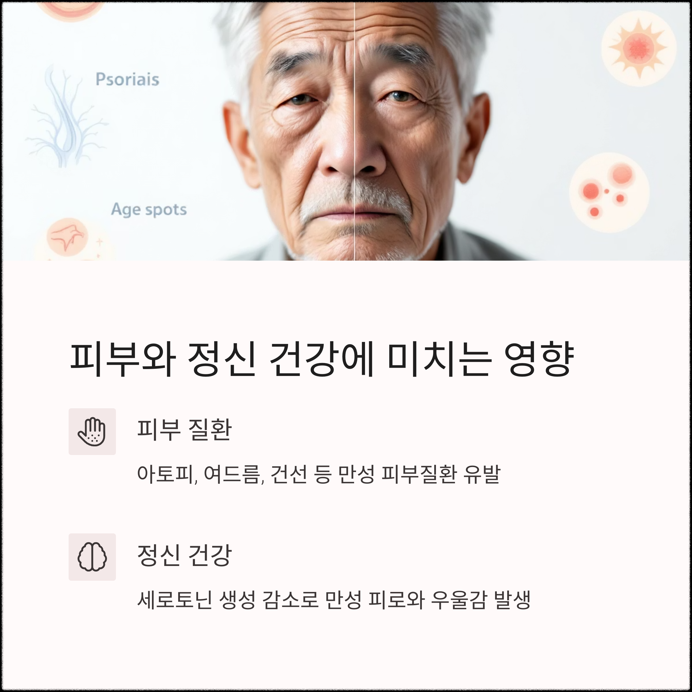 장내 환경이 악화되면 피부 상태에도 직접적인 영향을 미칩니다. 아토피, 여드름, 건선과 같은 만성 피부질환은 장내 독소가 혈류를 통해 온몸으로 퍼지면서 발생할 수 있습니다. 또한 만성 피로나 무기력함을 호소하는 경우, 장내 미생물 불균형으로 세로토닌 생성이 줄어들어 정신 건강에도 영향을 미칩니다. 실제로 장은 ‘제2의 뇌’로 불릴 만큼 감정과 밀접한 연관이 있어, 장 건강을 지키는 것이 곧 심리적 안정으로도 이어집니다.