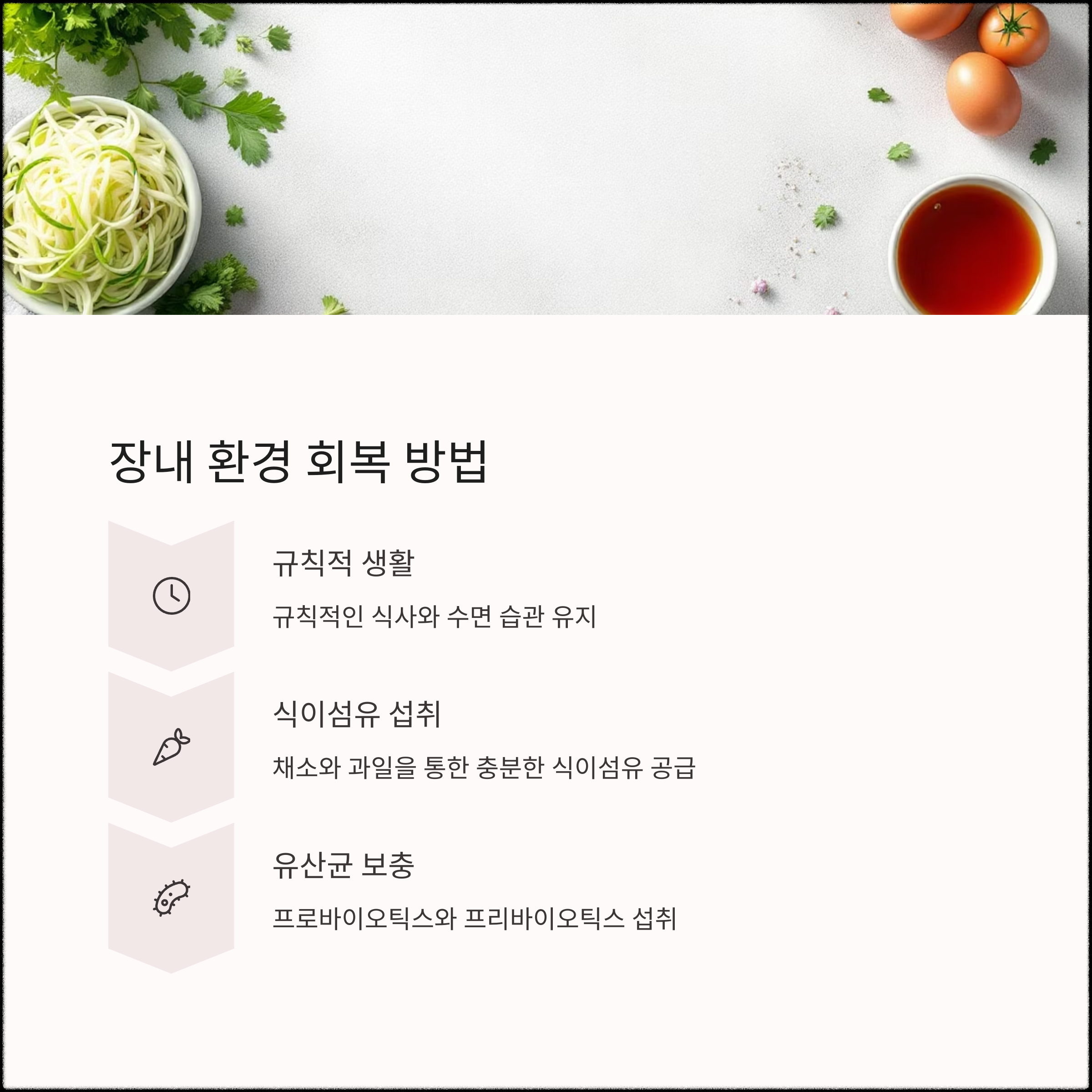 장내 환경을 회복시키기 위해서는 규칙적인 식사와 수면, 충분한 수분 섭취, 식이섬유가 풍부한 채소 섭취가 중요합니다. 유산균과 프리바이오틱스가 포함된 식품은 유익균의 성장을 도와 장내 생태계를 안정시킵니다. 또한 가공식품, 인공감미료, 트랜스지방 등 장에 악영향을 주는 음식은 피하는 것이 좋습니다. 일상 속 작은 습관 변화가 장 건강 개선의 핵심입니다.