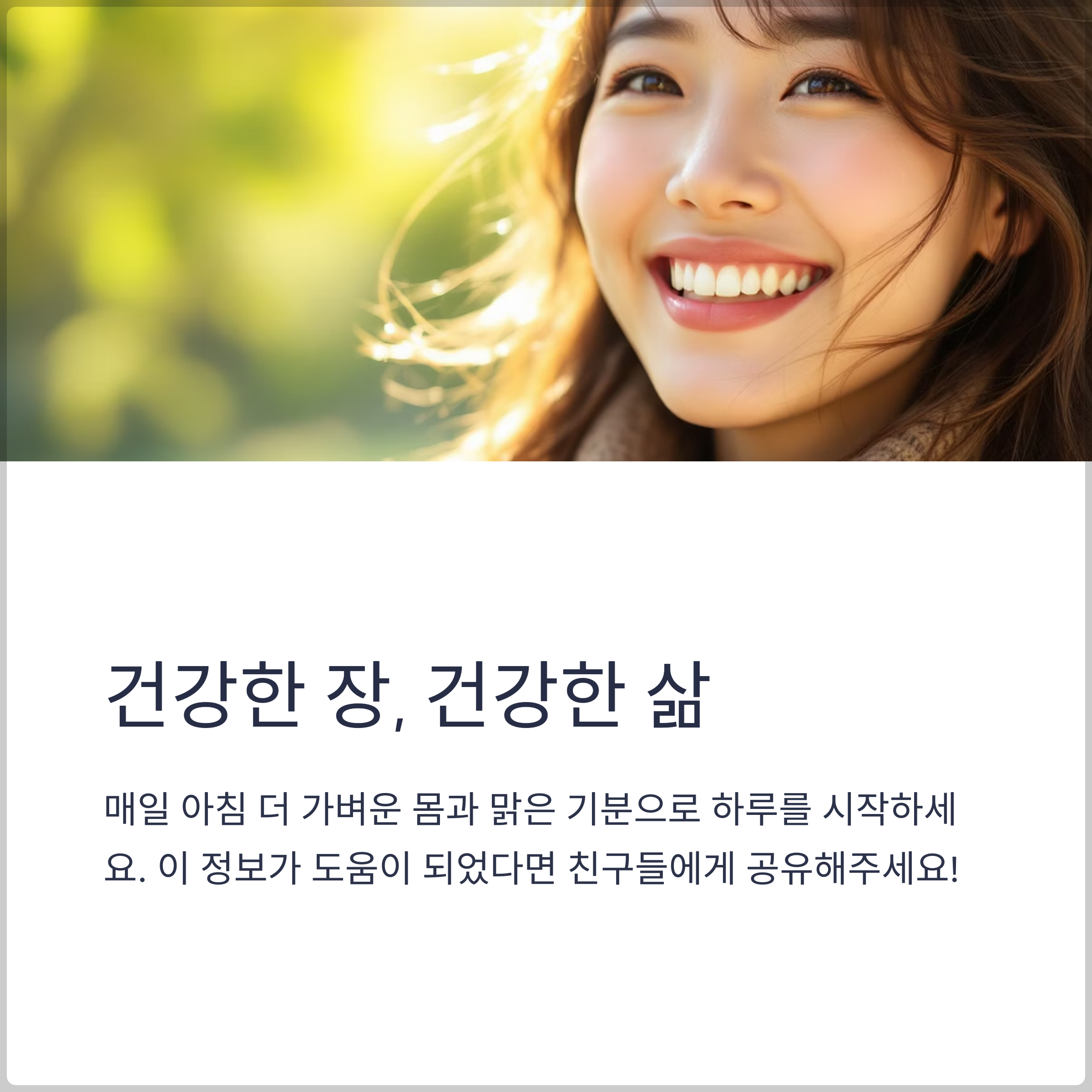 지금까지 장 건강의 중요성과 이를 지키는 생활 습관에 대해 알아보았습니다. 바쁜 일상 속에서도 꾸준한 실천은 분명 몸의 변화를 가져올 수 있습니다. 매일 아침 더 가벼운 몸과 맑은 기분으로 하루를 시작하고 싶다면, 오늘 배운 내용을 하나씩 실천해 보세요. 여러분의 건강한 내일을 응원합니다.