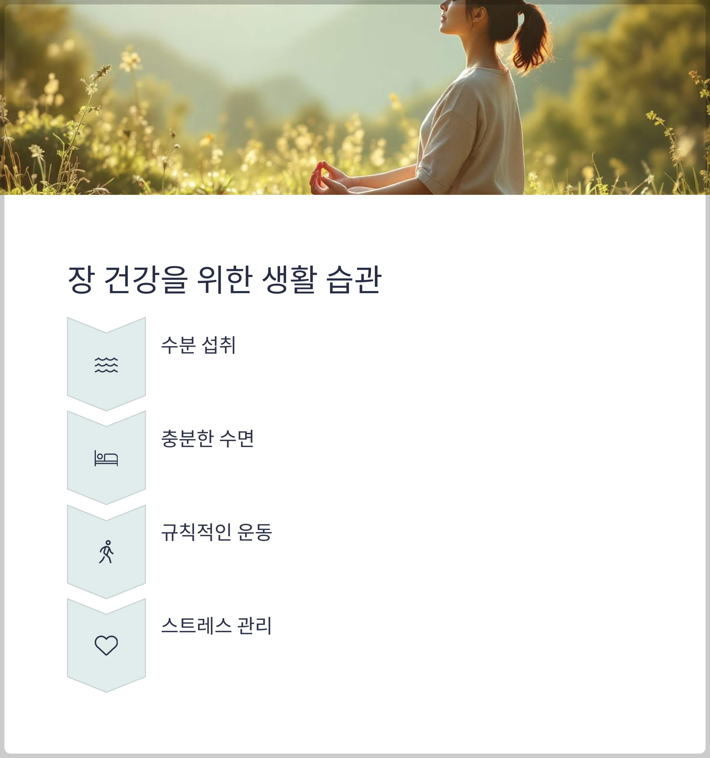 장 건강은 단순히 유산균 섭취만으로 해결되지 않습니다. 올바른 식습관, 충분한 수면, 스트레스 관리 등 전반적인 생활습관을 함께 관리해야 진정한 효과를 볼 수 있어요.