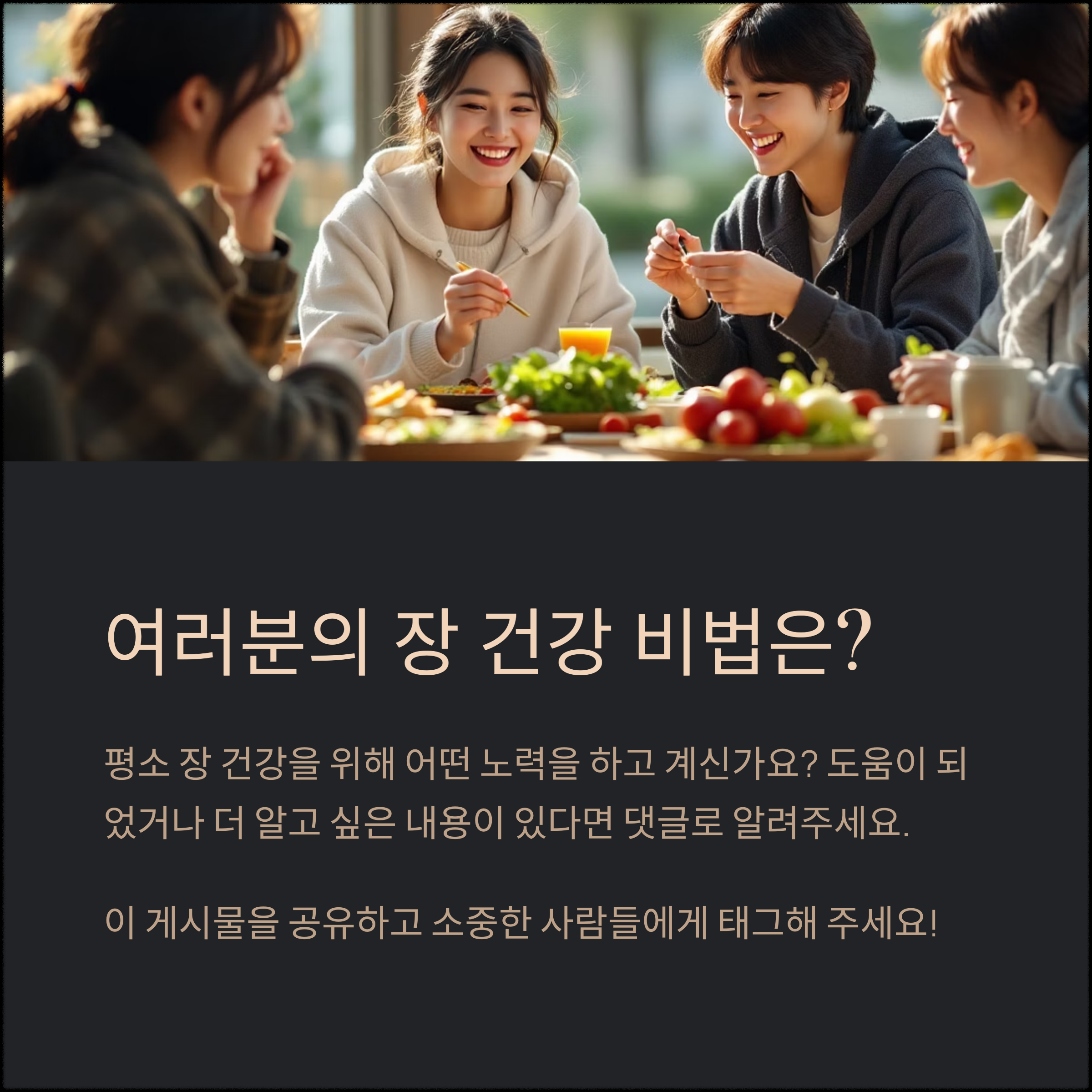 평소 장 건강을 위해 어떤 노력을 하고 계신가요? 도움이 되었거나 더 알고 싶은 내용이 있다면 댓글로 알려주세요. 다양한 의견을 통해 건강한 소통의 장이 되기를 바랍니다.