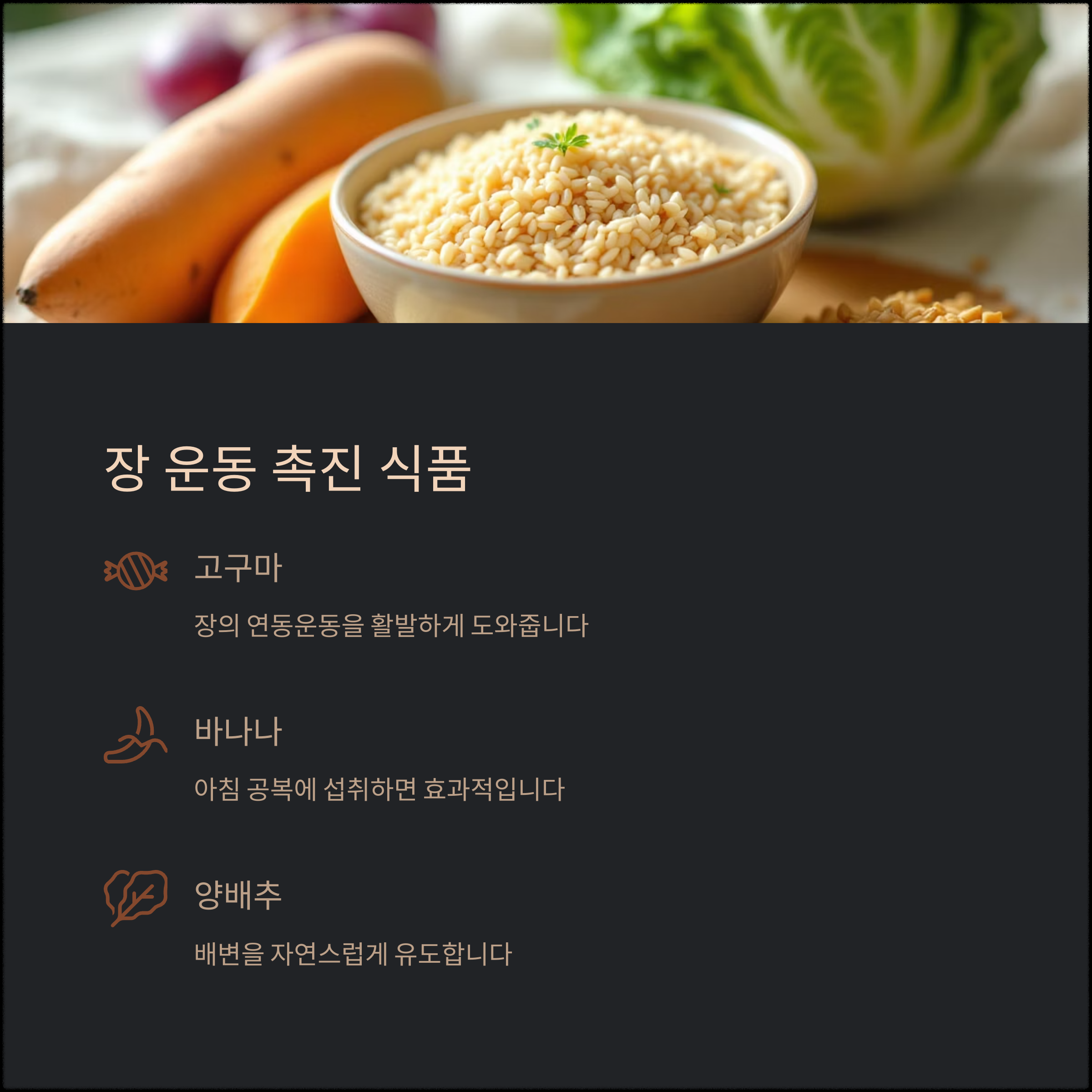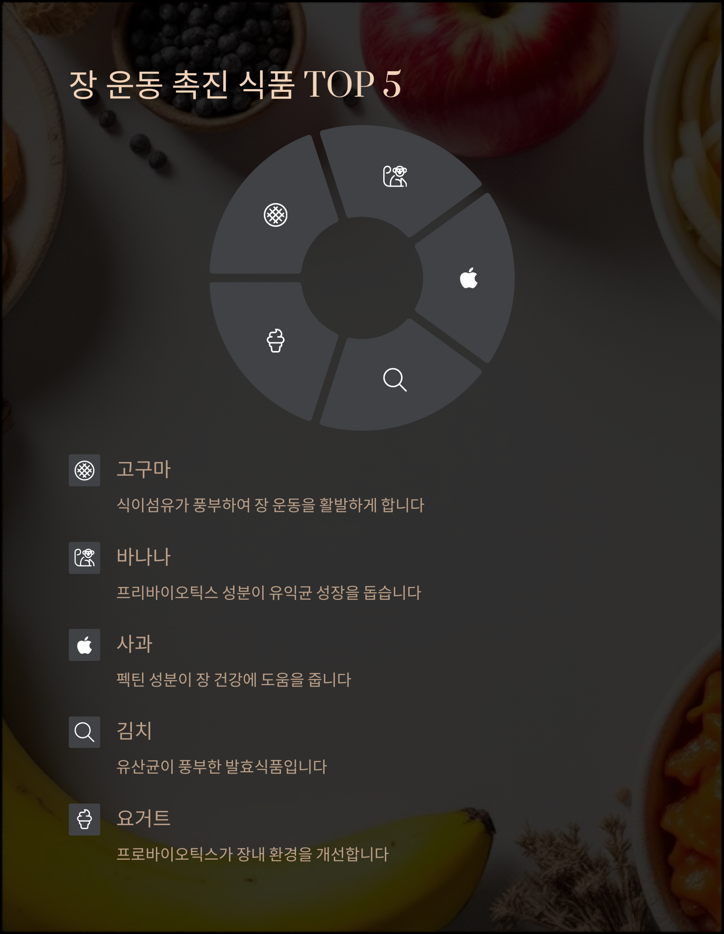 | 장 건강 음식 | 식이섬유 조합 | 장 운동 촉진 |