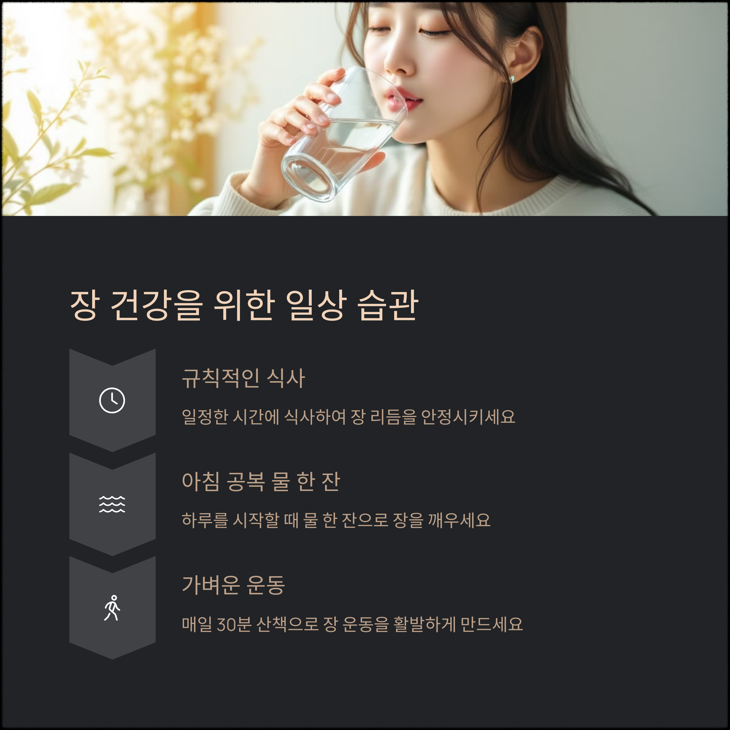 일상 속에서 장 건강을 위한 팁은 다양합니다. 첫째, 식사는 항상 일정하게 하며 규칙적인 생활을 유지해야 장 리듬이 안정됩니다. 둘째, 아침 공복에 물 한 잔을 마시고 제철 과일이나 요거트를 곁들인 식사를 하세요. 셋째, 가공식품 섭취를 줄이고 채소와 통곡물의 비중을 높이는 것이 중요합니다. 넷째, 스트레스를 관리하는 것도 장 건강에 큰 영향을 줍니다. 장과 뇌는 연결되어 있어 불안하거나 스트레스를 받으면 장기능도 저하됩니다. 마지막으로, 매일 30분 정도 가벼운 산책이나 운동을 병행하면 장 운동이 활발해집니다. 작지만 꾸준한 습관이 건강한 장을 만듭니다.