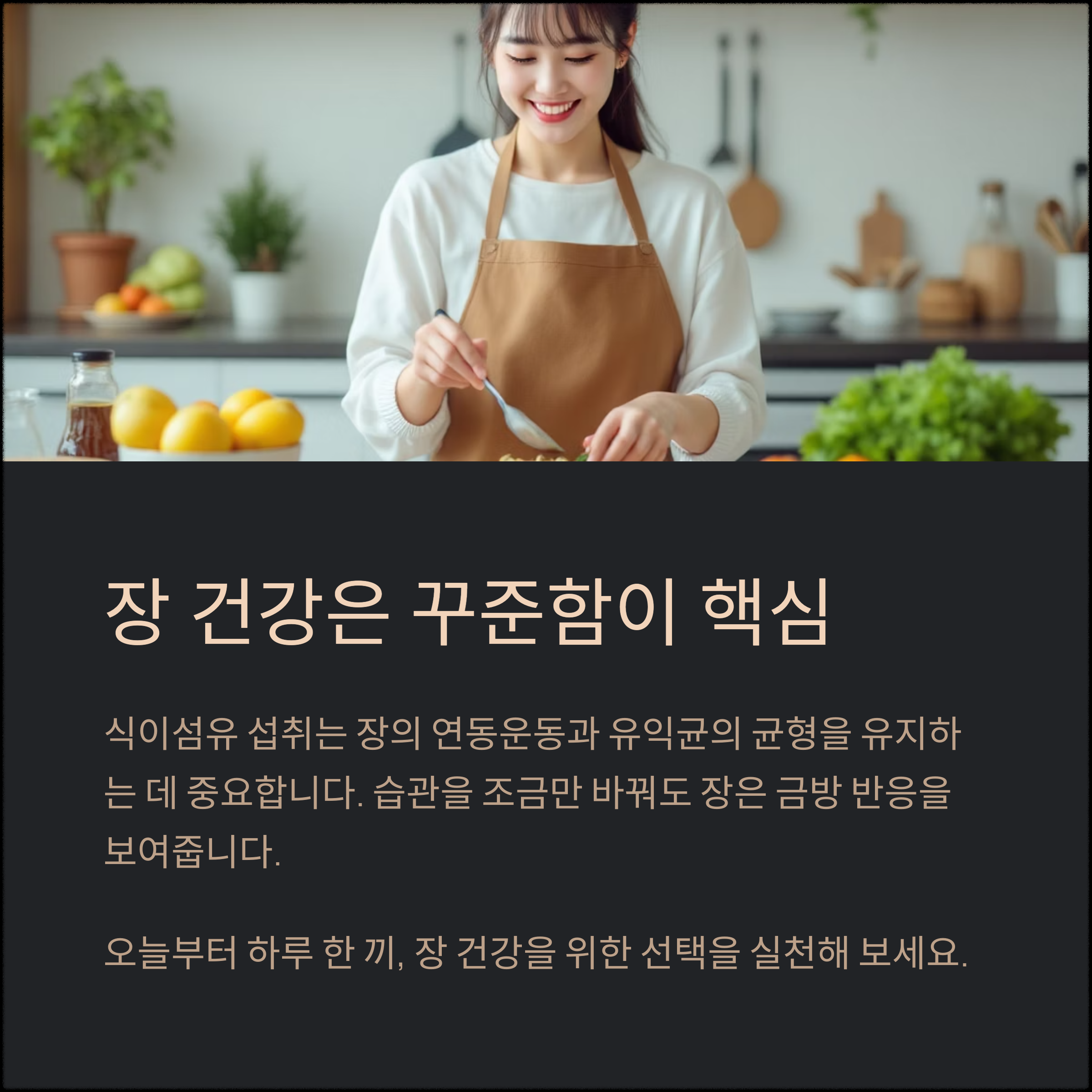 장 건강은 일시적인 관리로 해결되는 문제가 아닙니다. 평소에 꾸준한 식습관과 생활 패턴이 필요합니다. 특히 식이섬유 섭취는 장의 연동운동과 유익균의 균형을 유지하는 데 중요한 역할을 하며, 현대인의 건강에서 절대 빠질 수 없는 요소입니다. 이번 글을 통해 어떤 식품이 장을 튼튼하게 만들고, 어떤 조합이 효과적인지를 구체적으로 알아보았습니다. 습관을 조금만 바꿔도 장은 금방 반응을 보여줍니다. 오늘부터 하루 한 끼, 장 건강을 위한 선택을 실천해 보세요.