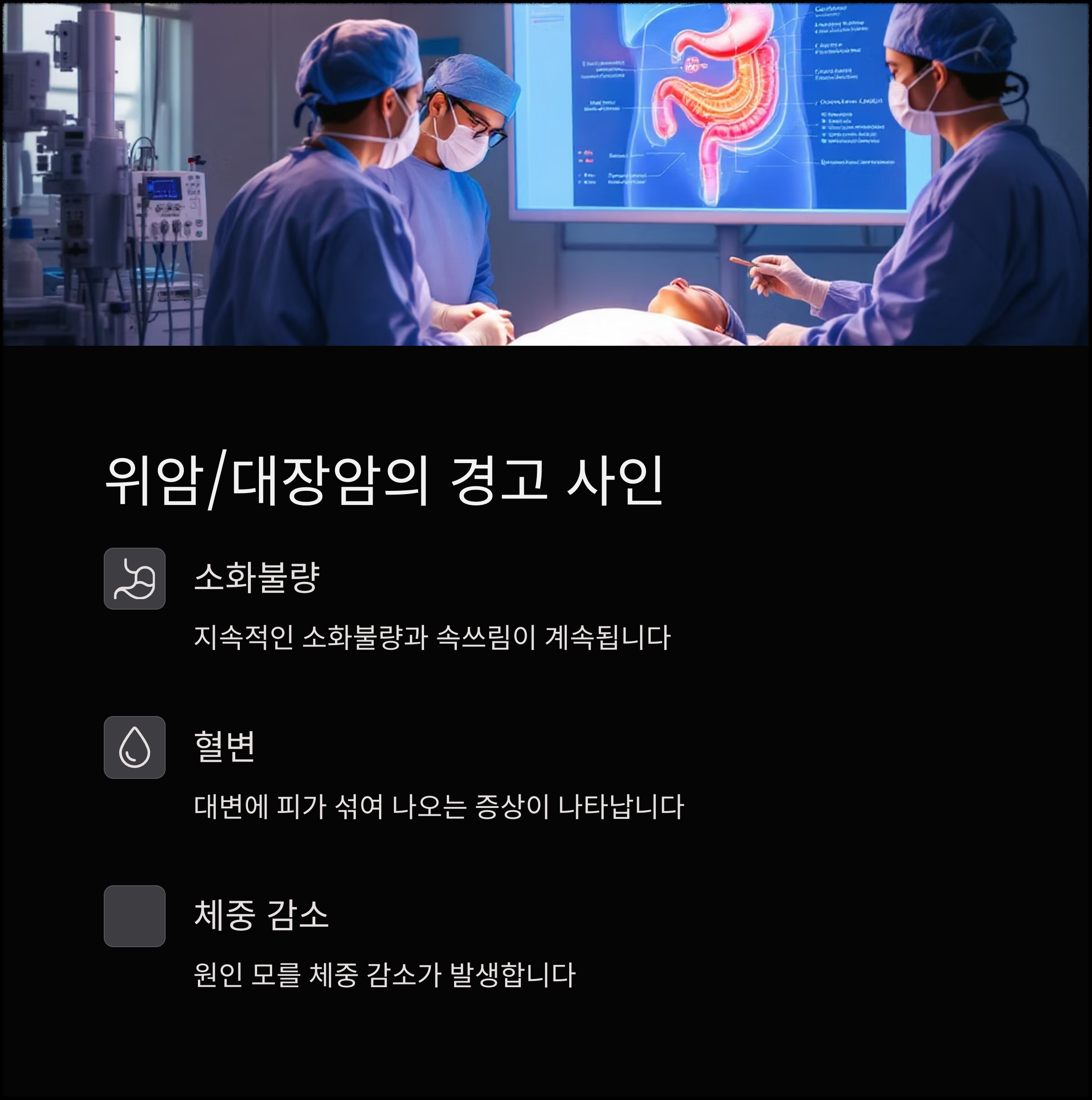위암/대장암 | 조기 발견 시 생존률↑ | 정기 내시경 필수 |