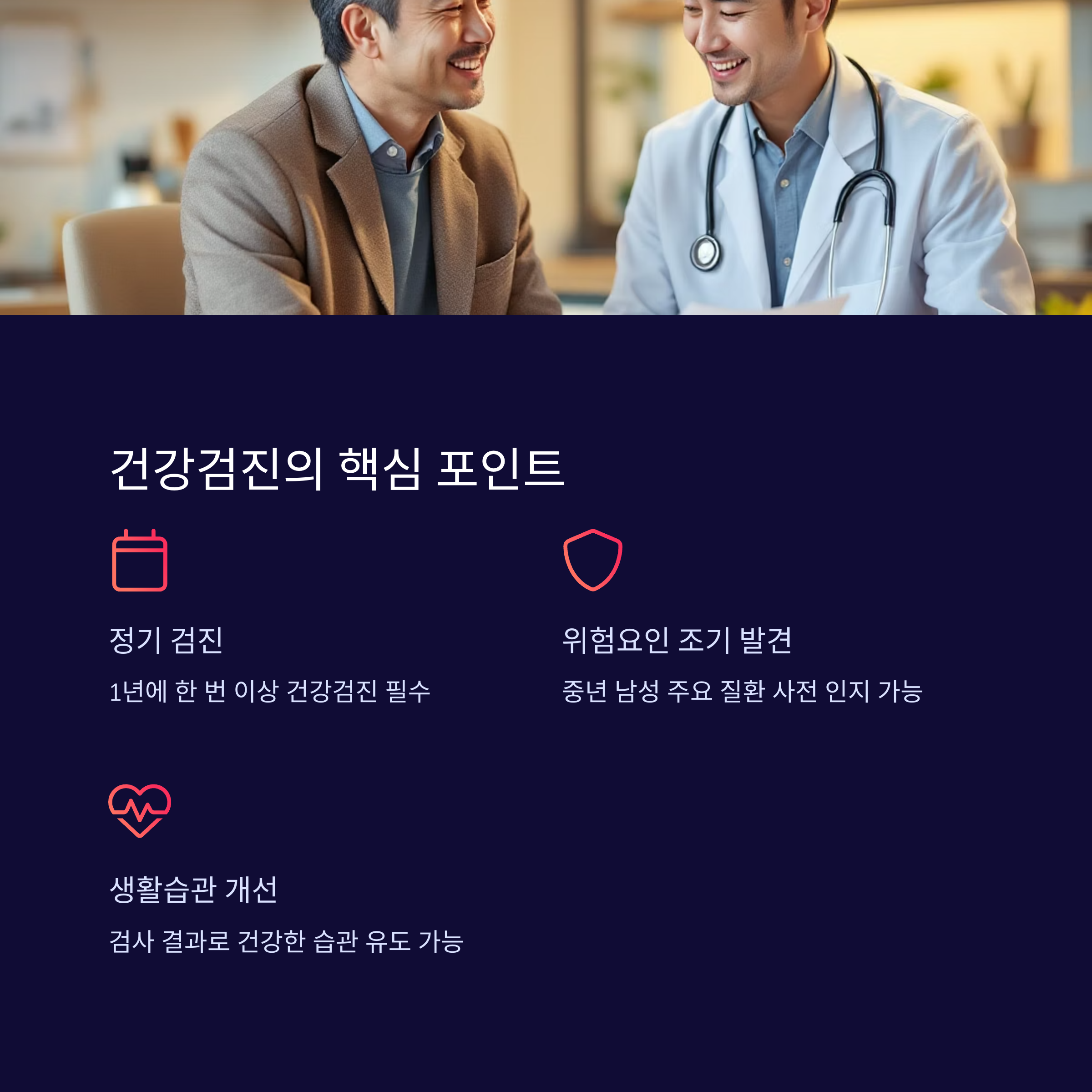 중년 남성의 건강관리는 단순히 체중 관리나 운동으로 끝나지 않습니다. 정기적인 혈액검사, 암 검진, 심혈관 건강 체크는 조기 발견과 예방을 위한 필수 수단입니다. 건강을 지키기 위한 첫걸음은 자신의 몸을 정확히 아는 것이며, 이는 정확한 건강검진에서 시작됩니다.
