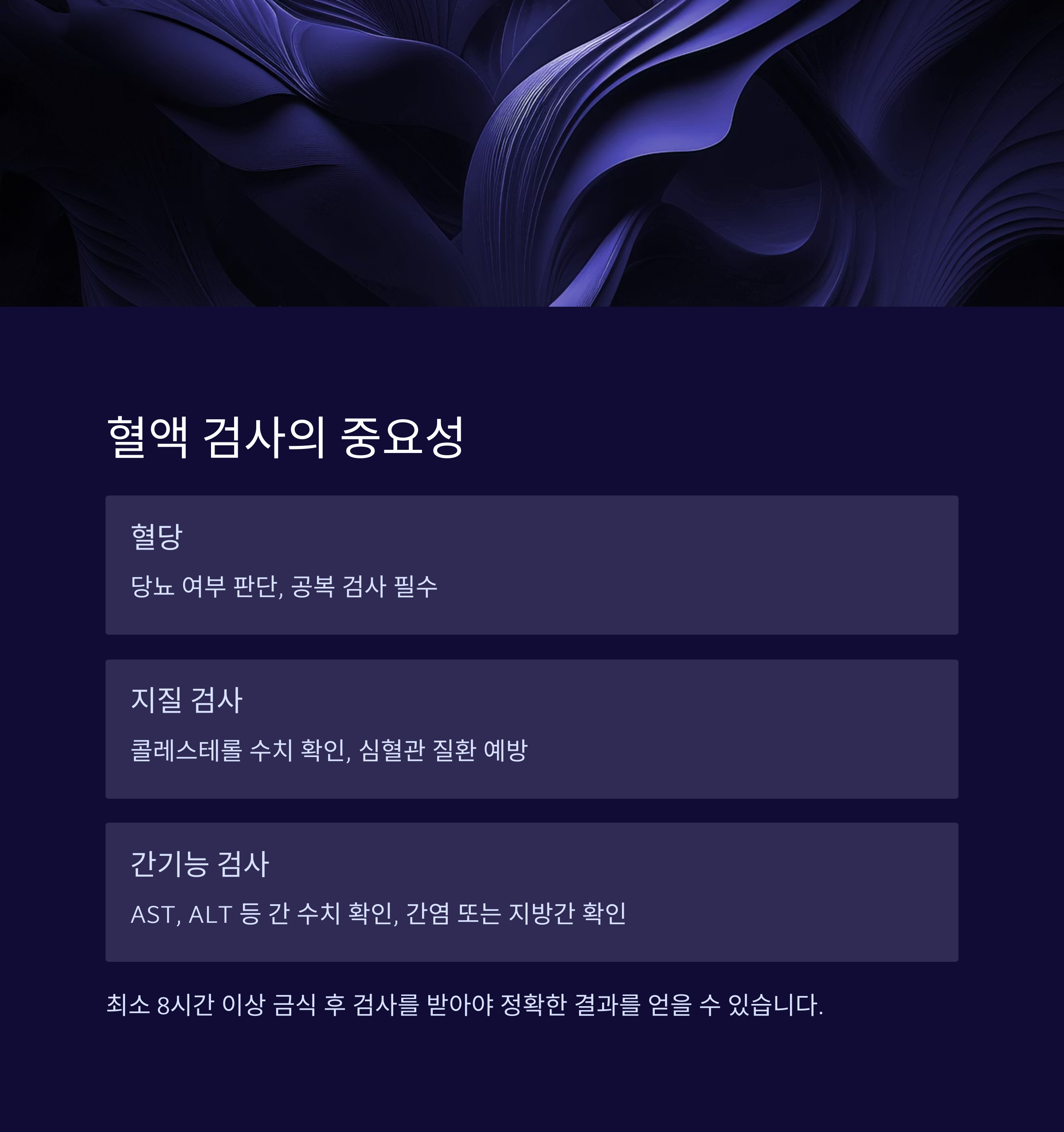 혈액 검사를 통해 각종 질병의 초기 신호를 미리 파악할 수 있으며, 건강한 생활습관을 계획하는 데 큰 도움이 됩니다.