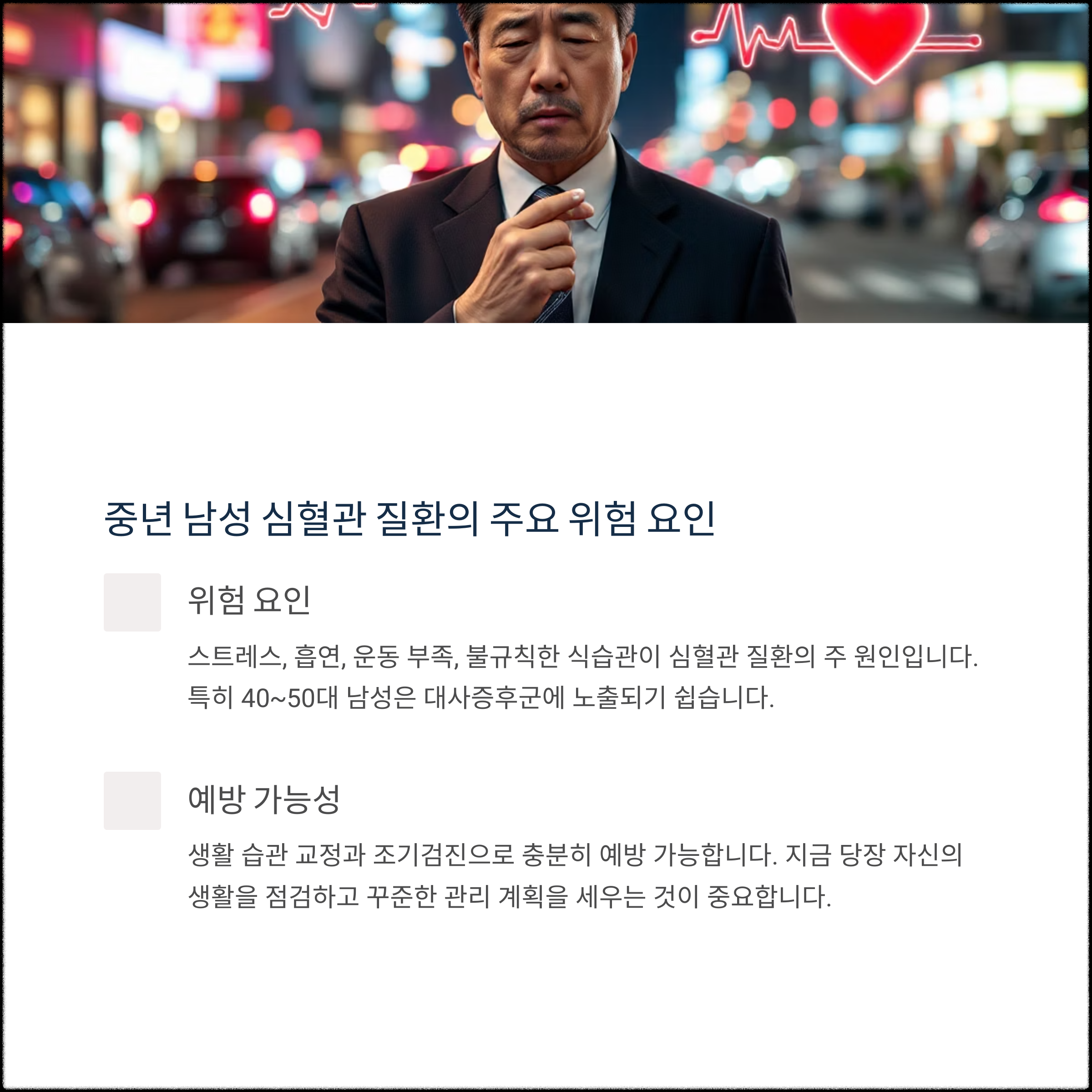 | 중년 남성 위험 요인 | 스트레스, 흡연, 운동 부족이 심혈관 질환 주 원인 |