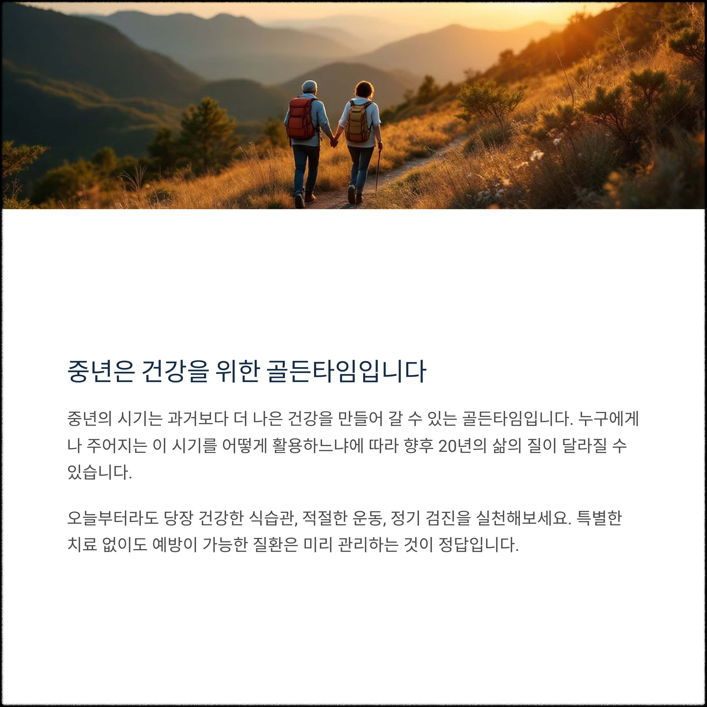 중년의 시기는 과거보다 더 나은 건강을 만들어 갈 수 있는 골든타임입니다. 누구에게나 주어지는 이 시기를 어떻게 활용하느냐에 따라 향후 20년의 삶의 질이 달라질 수 있습니다. 오늘부터라도 당장 건강한 식습관, 적절한 운동, 정기 검진을 실천해보세요. 특별한 치료 없이도 예방이 가능한 질환은 미리 관리하는 것이 정답입니다. 늦었다고 느낄 때가 시작하기에 가장 좋은 시점입니다.