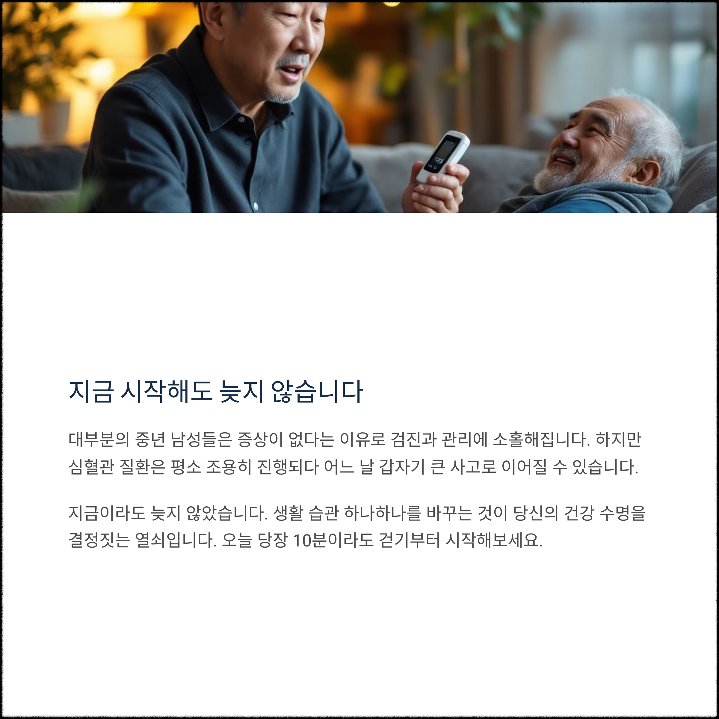 혹시 ‘나는 아직 건강하니까 괜찮다’는 생각을 하고 계신가요? 대부분의 중년 남성들이 증상이 없다는 이유로 검진과 관리에 소홀해지는 경우가 많습니다. 하지만 심혈관 질환은 평소 조용히 진행되다 어느 날 갑자기 큰 사고로 이어질 수 있습니다. 지금이라도 늦지 않았습니다. 생활 습관 하나하나를 바꾸는 것이 당신의 건강 수명을 결정짓는 열쇠입니다. 오늘 당장 걷기부터 시작해보세요. 단 10분이라도 몸을 움직이는 것이 큰 차이를 만들어냅니다.