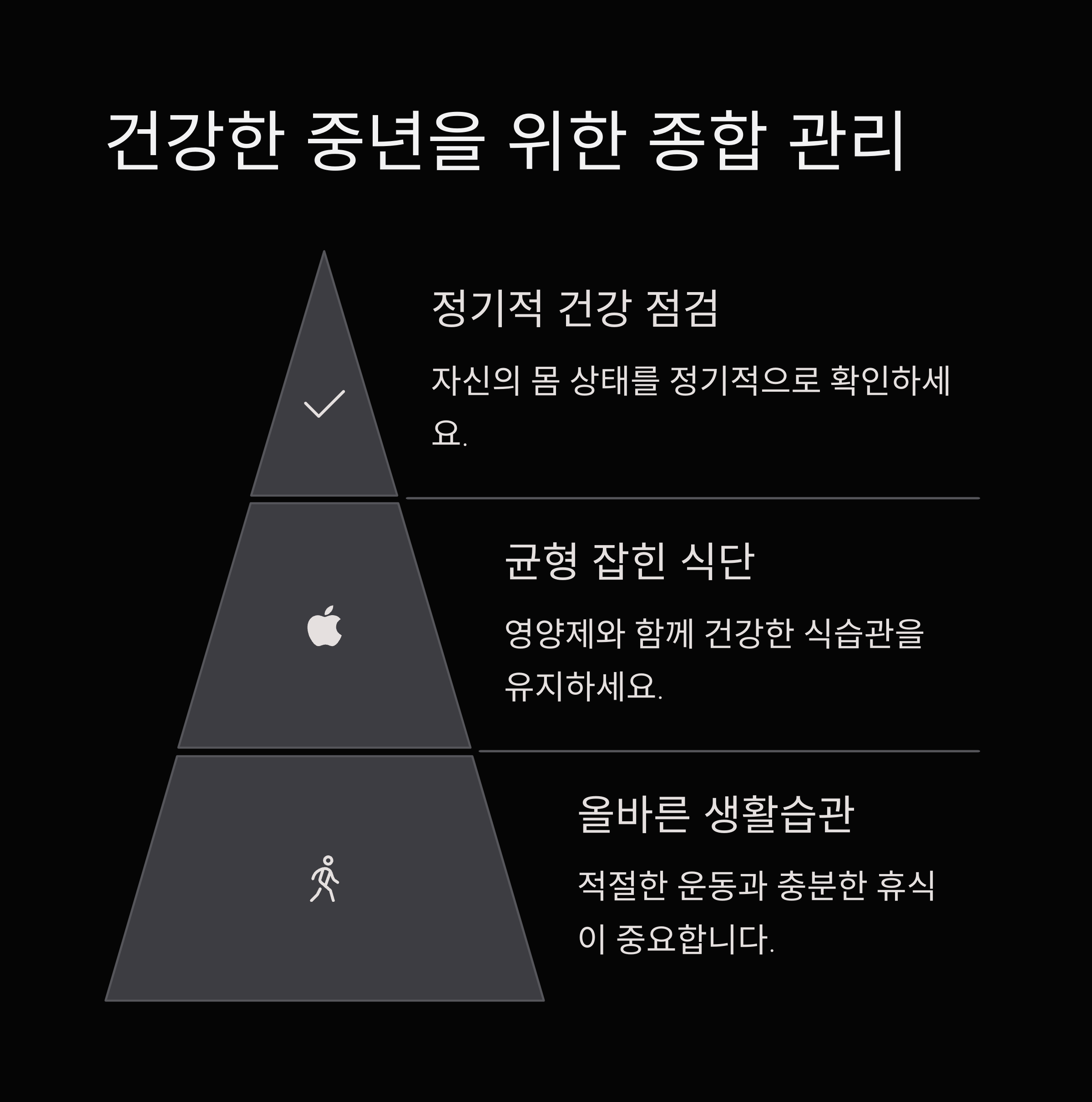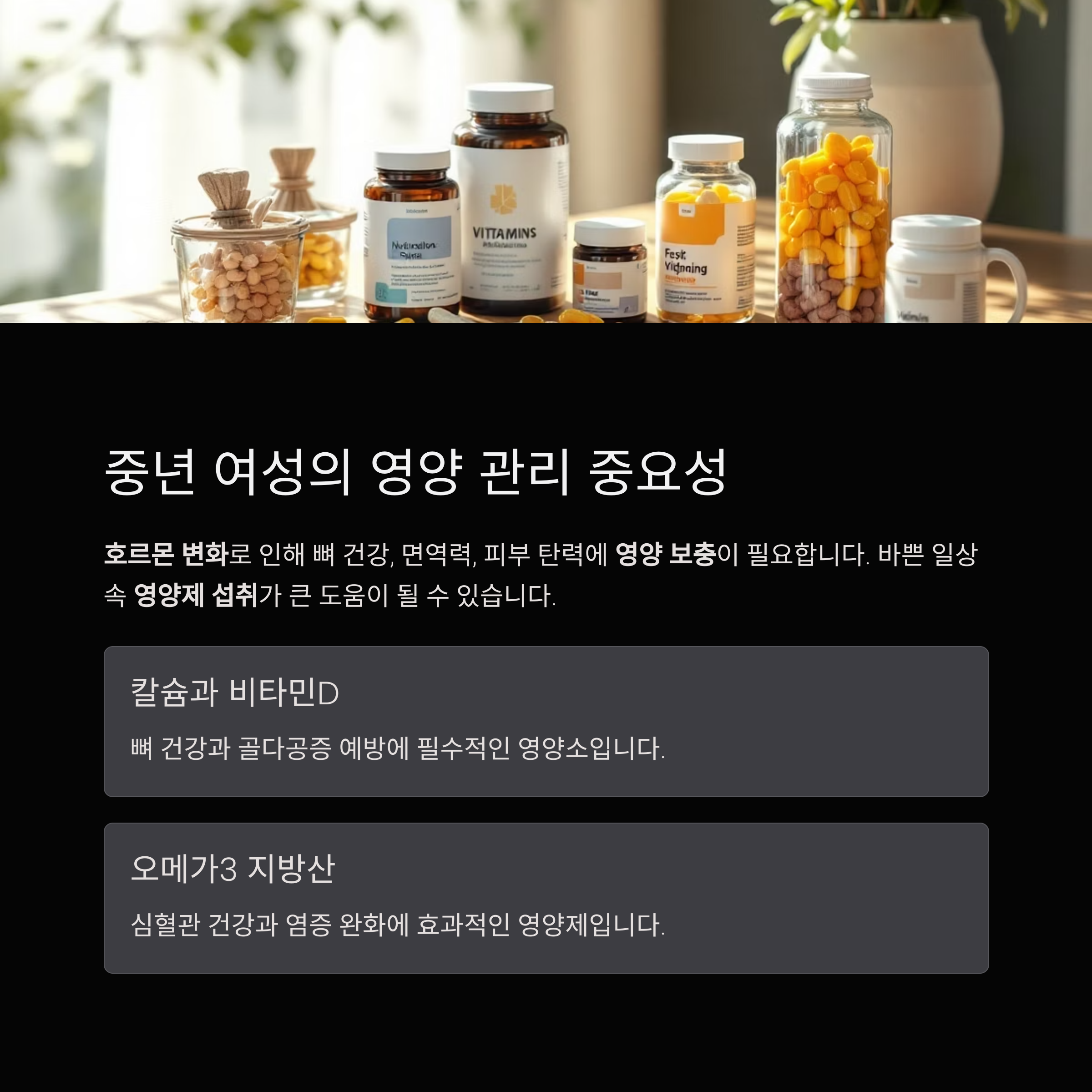 중년 여성의 건강 관리는 단순한 영양제 섭취를 넘어 올바른 생활습관과 균형 잡힌 식단이 함께 이루어져야 합니다. 오늘 소개해드린 추천 영양제와 복용 팁을 참고하시어 스스로의 건강을 더욱 꼼꼼히 관리해 보세요. 무엇보다 자신의 몸 상태를 정기적으로 점검하고, 필요한 경우 전문가의 상담을 통해 개인 맞춤형 영양 관리 계획을 세우는 것이 중요합니다. 건강하고 활기찬 중년을 응원합니다.