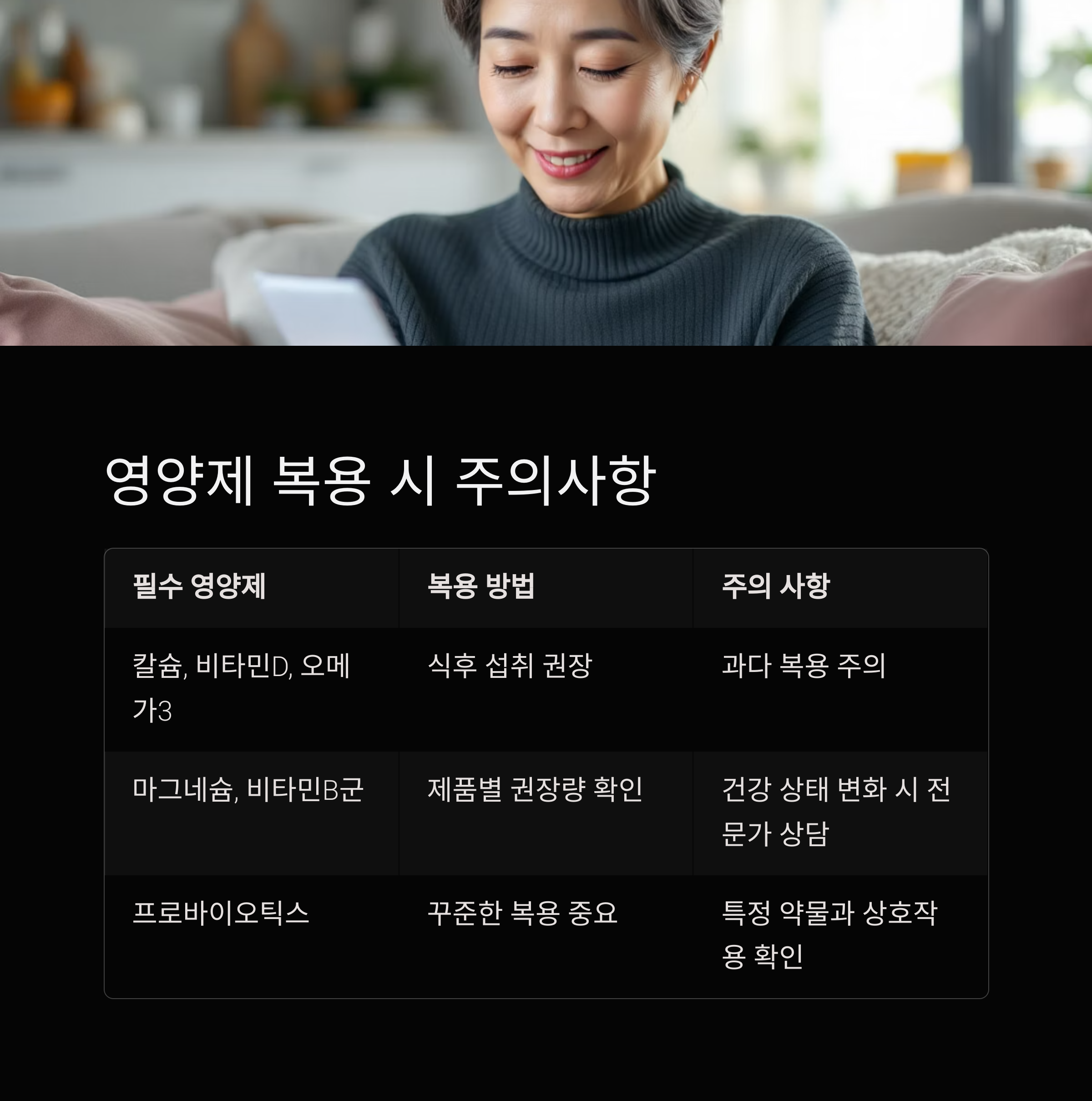 | 칼슘, 비타민D, 오메가3, 마그네슘, 비타민B군 | 제품별 권장 복용량 확인 후 식후 섭취 권장 | 과다 복용 주의, 건강 상태 변화 시 전문가 상담 |