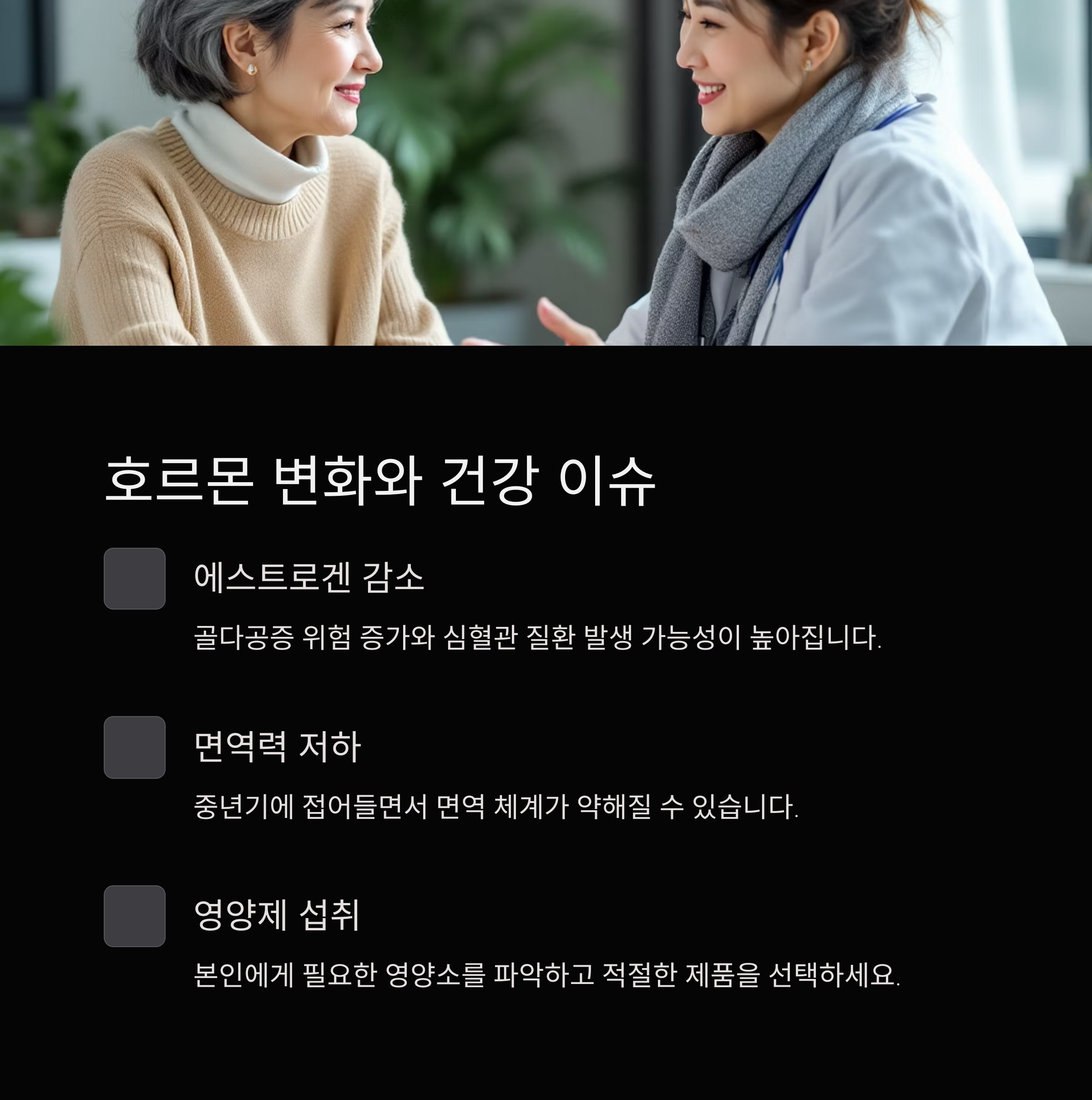 중년 여성의 건강은 호르몬 변화와 함께 많은 변화를 겪게 됩니다. 특히 에스트로겐 감소로 인한 골다공증 위험 증가, 심혈관 질환 발생 가능성, 면역력 저하 등이 주요한 건강 이슈로 떠오르고 있습니다. 이러한 변화를 예방하고 건강한 삶을 유지하기 위해서는 식단 외에도 영양제 섭취가 효과적인 방법이 될 수 있습니다. 다만 본인에게 필요한 영양소를 파악하고 적절한 제품을 선택하는 것이 중요합니다.