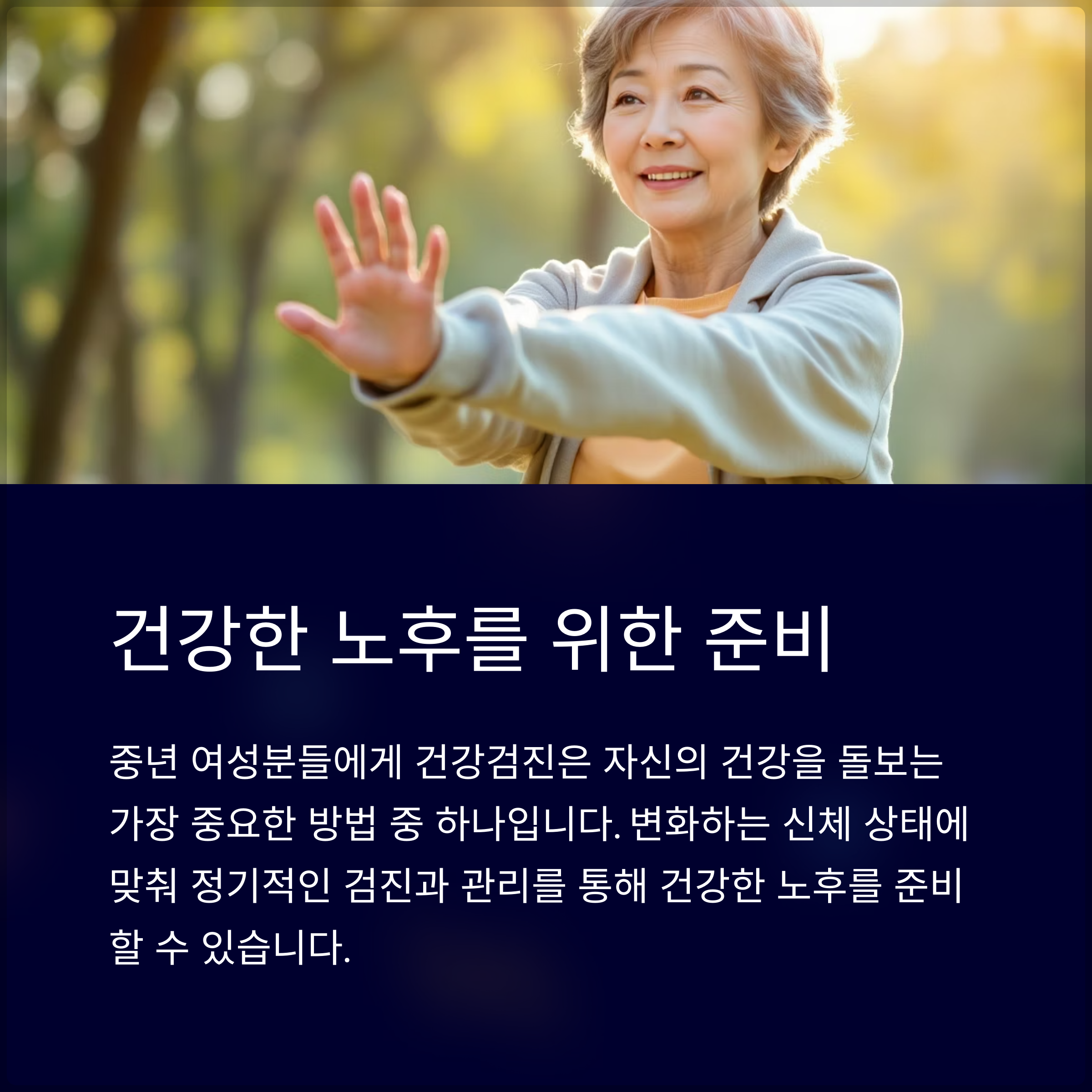 중년 여성분들에게 건강검진은 자신의 건강을 돌보는 가장 중요한 방법 중 하나입니다. 변화하는 신체 상태에 맞춰 정기적인 검진과 관리를 통해 건강한 노후를 준비할 수 있습니다. 오늘 안내드린 필수 검진 항목을 참고하여 본인의 건강 상태를 주기적으로 확인하시기 바랍니다. 건강은 미리 관리할수록 더 큰 가치를 지닙니다. 나와 가족을 위한 현명한 선택으로 건강한 삶을 이어가세요.