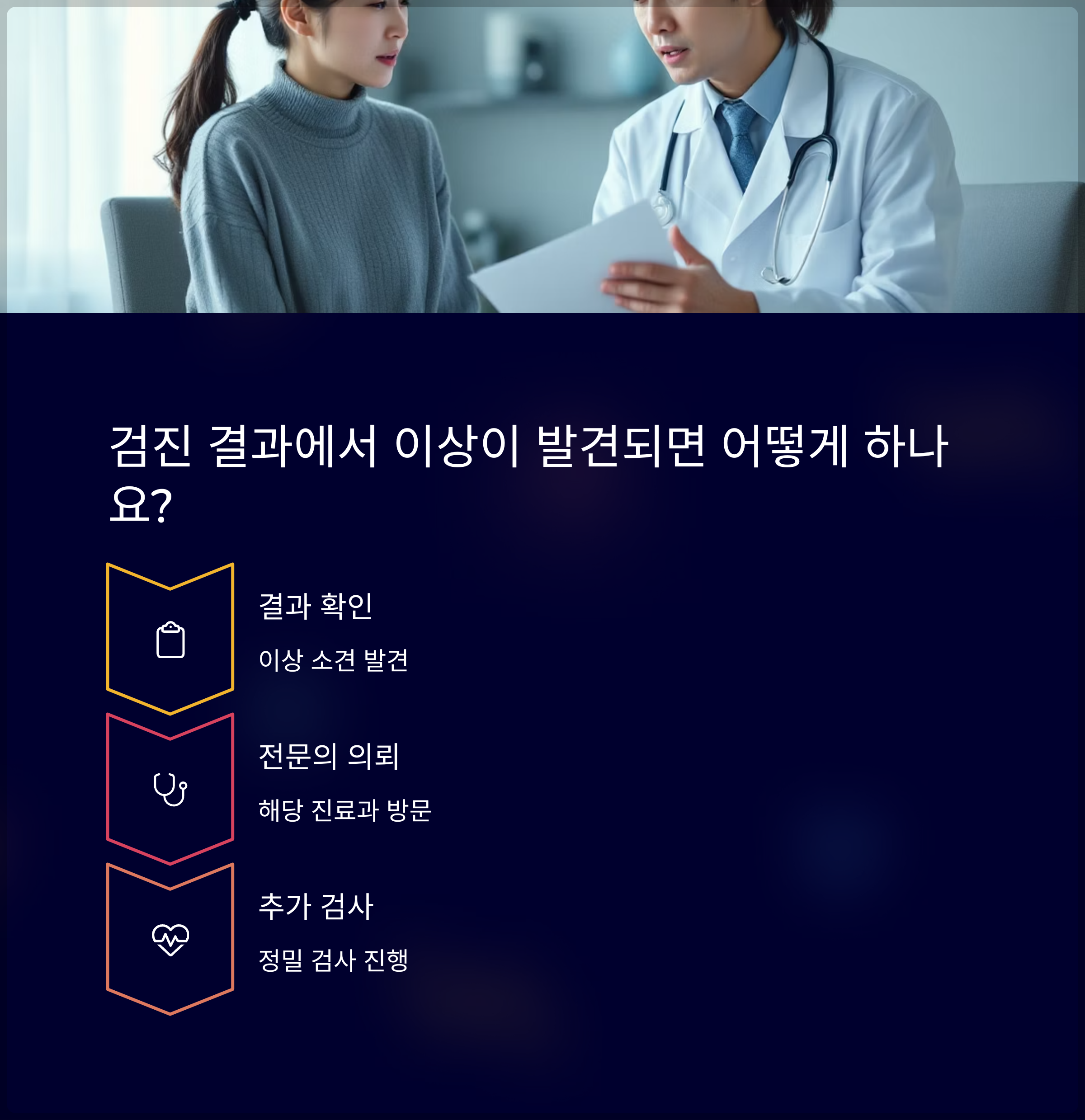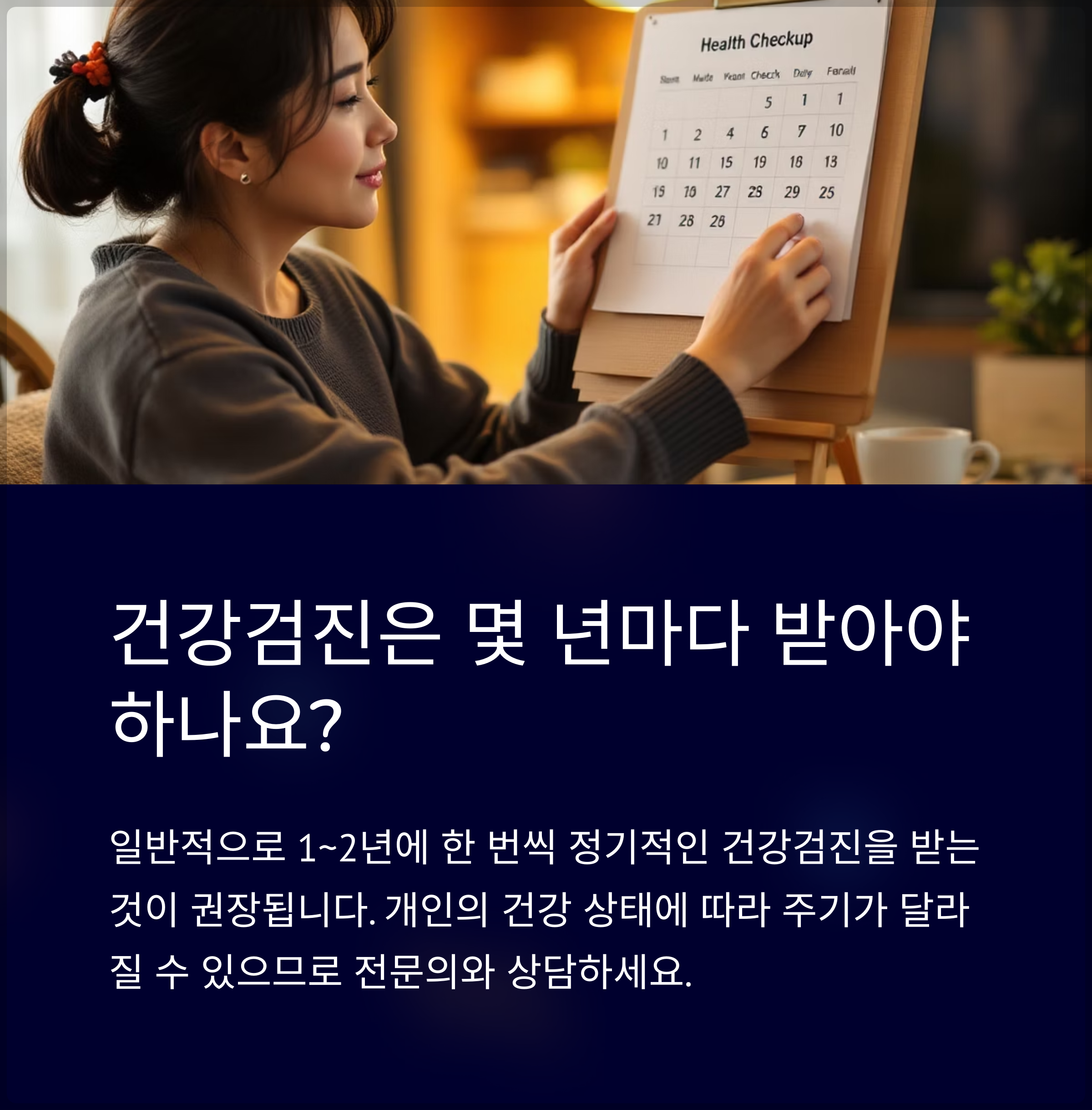 건강검진 주기는 개인의 건강 상태와 가족력을 고려하여 전문가와 상담 후 결정하는 것이 좋습니다. 일반적으로 1~2년에 한 번 정기적인 검진을 추천합니다. 건강검진 후에는 결과를 꼼꼼히 확인하고, 필요시 전문의 상담을 통해 추가 검사를 진행해야 합니다. 평소 건강한 식습관과 규칙적인 운동으로 건강을 유지하는 것도 중요합니다. 자신에게 맞는 검진 계획을 세워 꾸준히 실천해보세요.