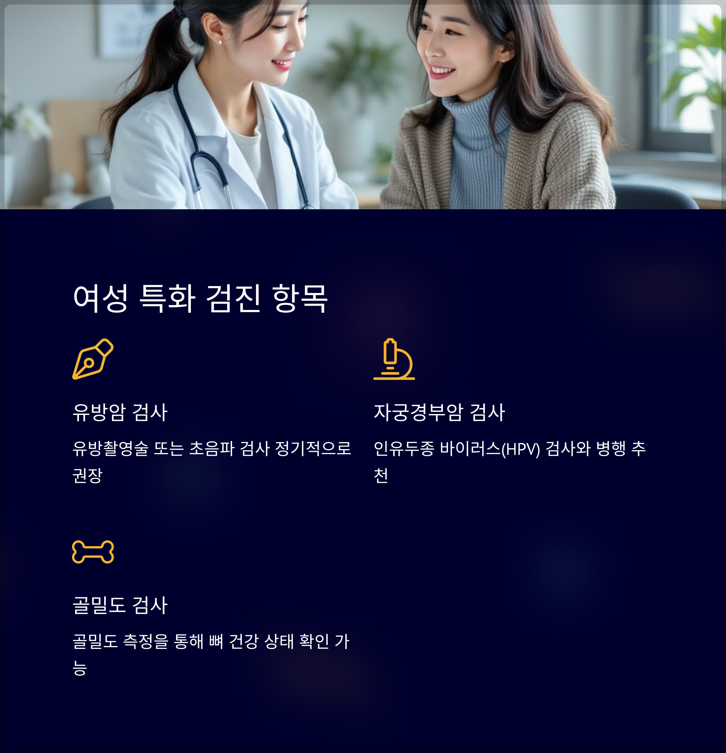 | 유방암 조기 발견과 예방을 위한 필수 검사입니다 | 자궁경부암 예방을 위해 주기적인 검진이 필요합니다 | 골다공증 예방 및 관리에 도움이 됩니다 |