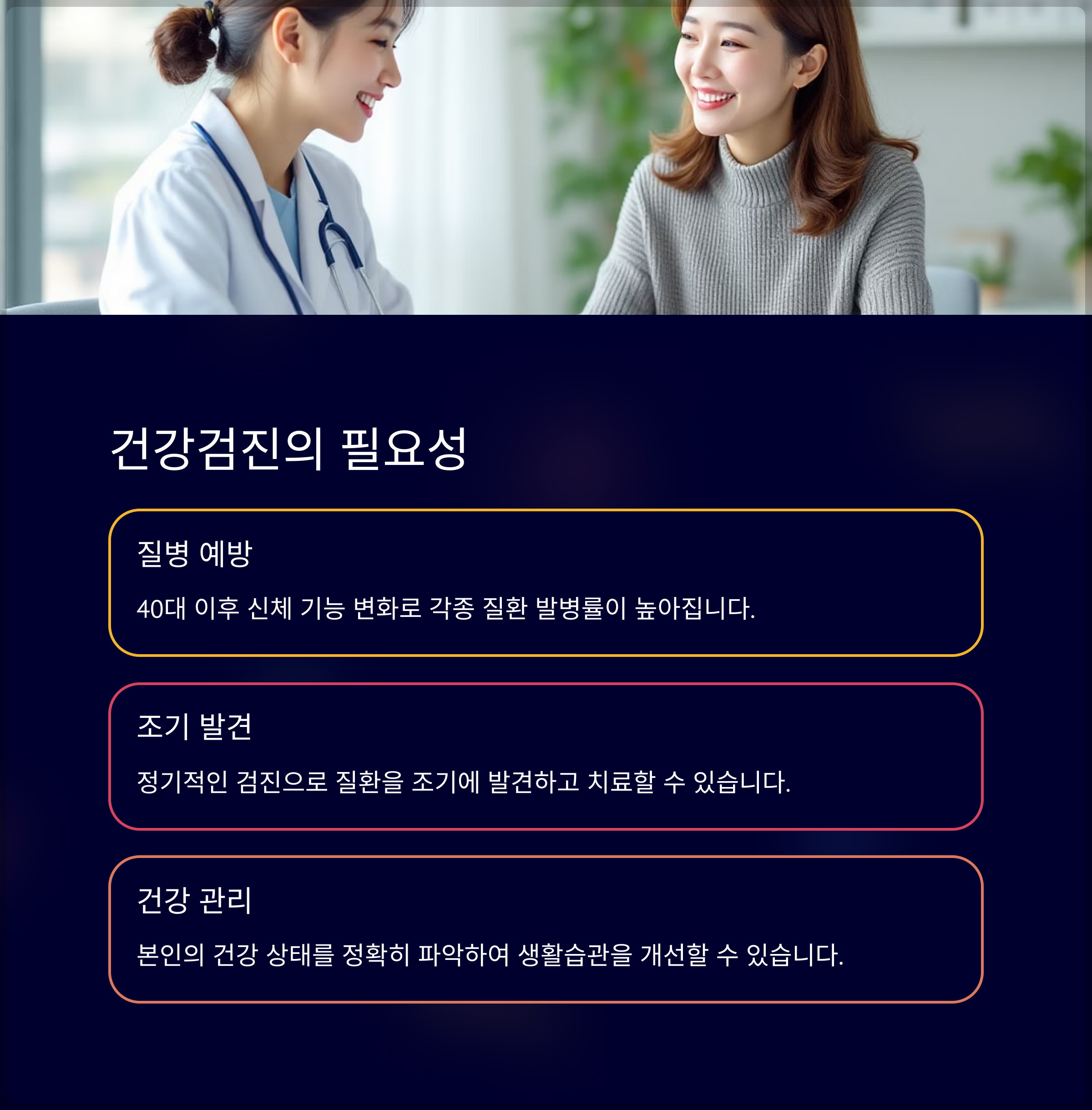 | 건강검진의 필요성 | 질병 예방과 조기 발견을 위해 반드시 필요합니다 |