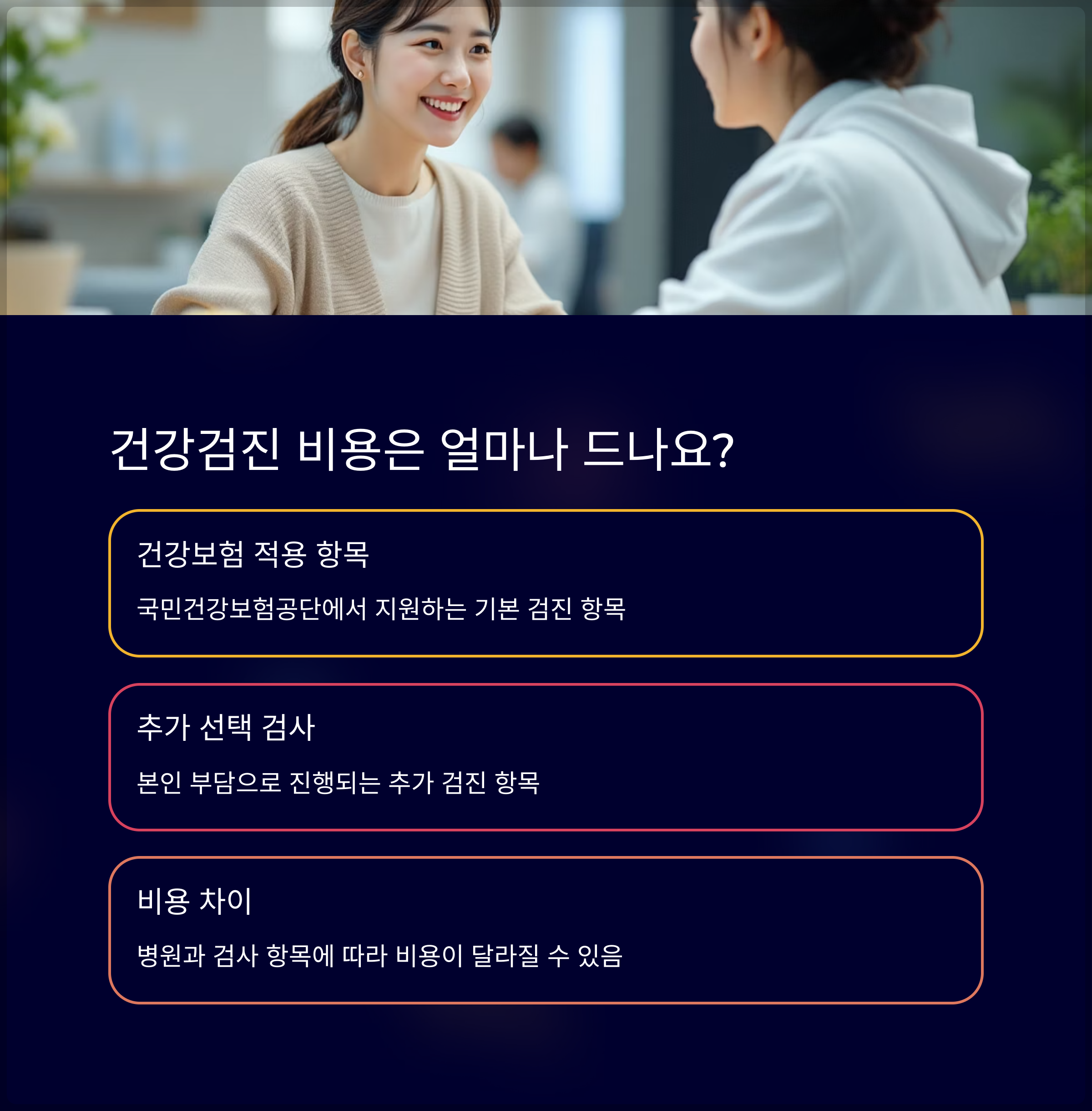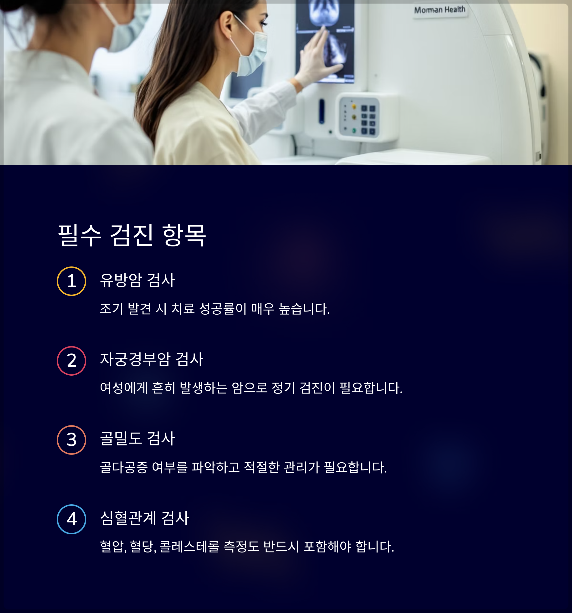 | 추천 검진 항목 | 유방암, 자궁경부암, 골밀도 검사 등 꼭 확인하세요 |