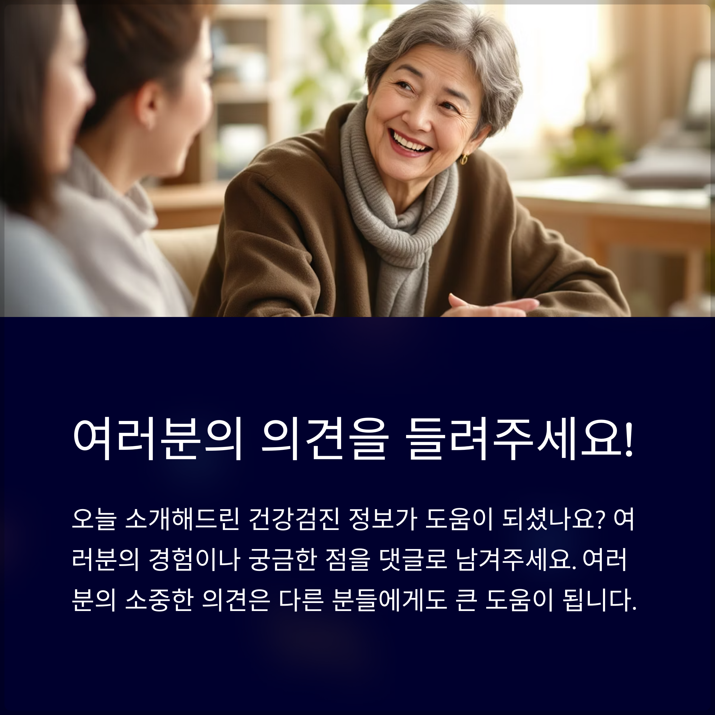 오늘 소개해드린 건강검진 정보가 도움이 되셨나요? 여러분의 경험이나 궁금한 점을 댓글로 남겨주세요. 여러분의 소중한 의견은 다른 분들에게도 큰 도움이 됩니다. 건강한 하루 되시길 바랍니다!