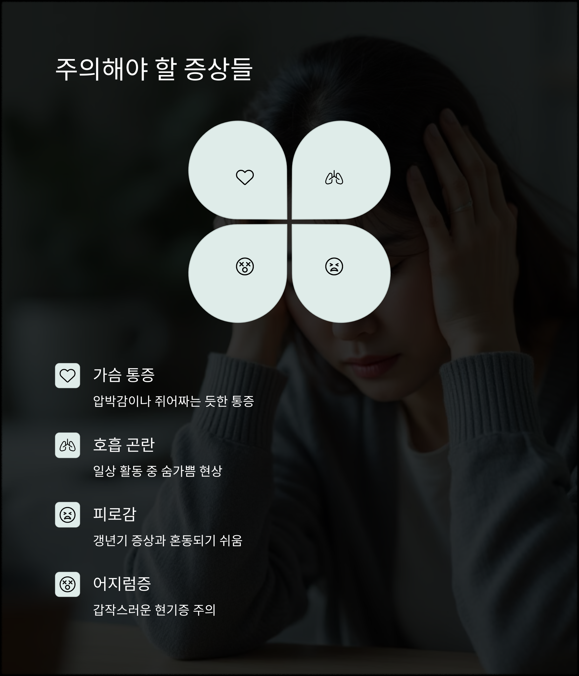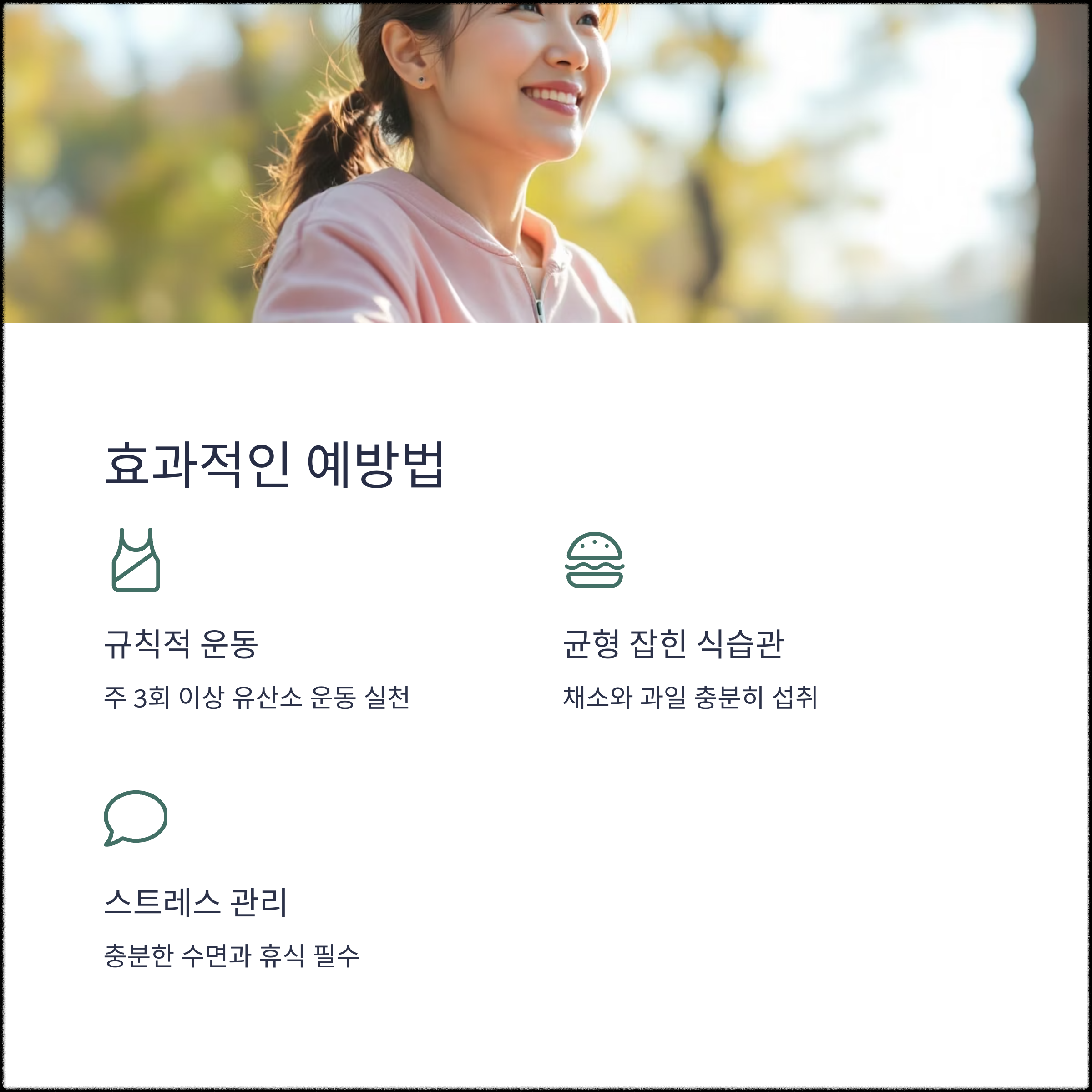 | 가슴 통증, 호흡 곤란, 피로감 | 운동, 식습관 개선, 스트레스 관리 | 연 1~2회 심혈관 건강 검진 |