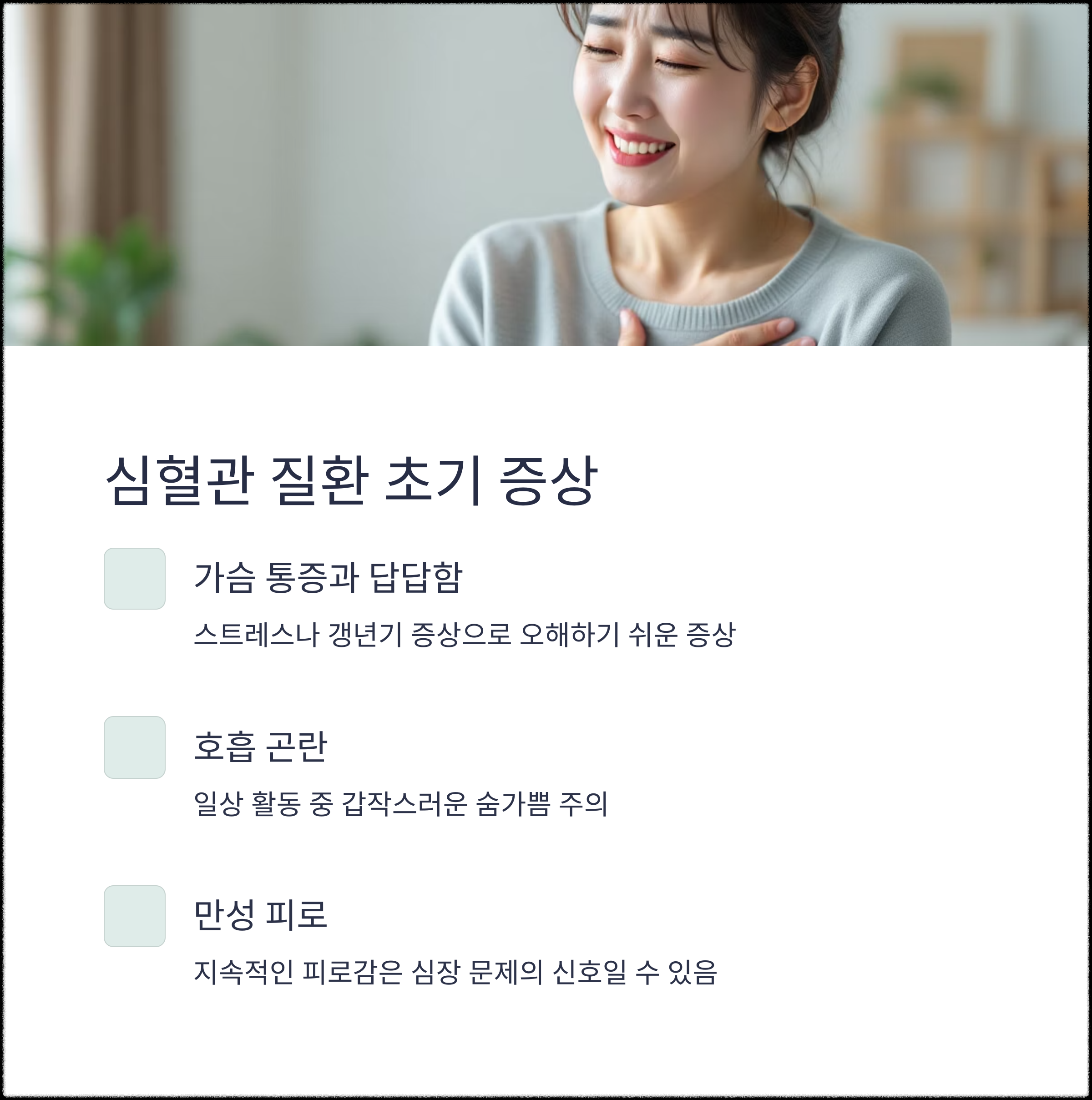 | 심혈관 질환 초기 증상 | 가슴 통증, 호흡 곤란, 만성 피로 등 증상 주의 |